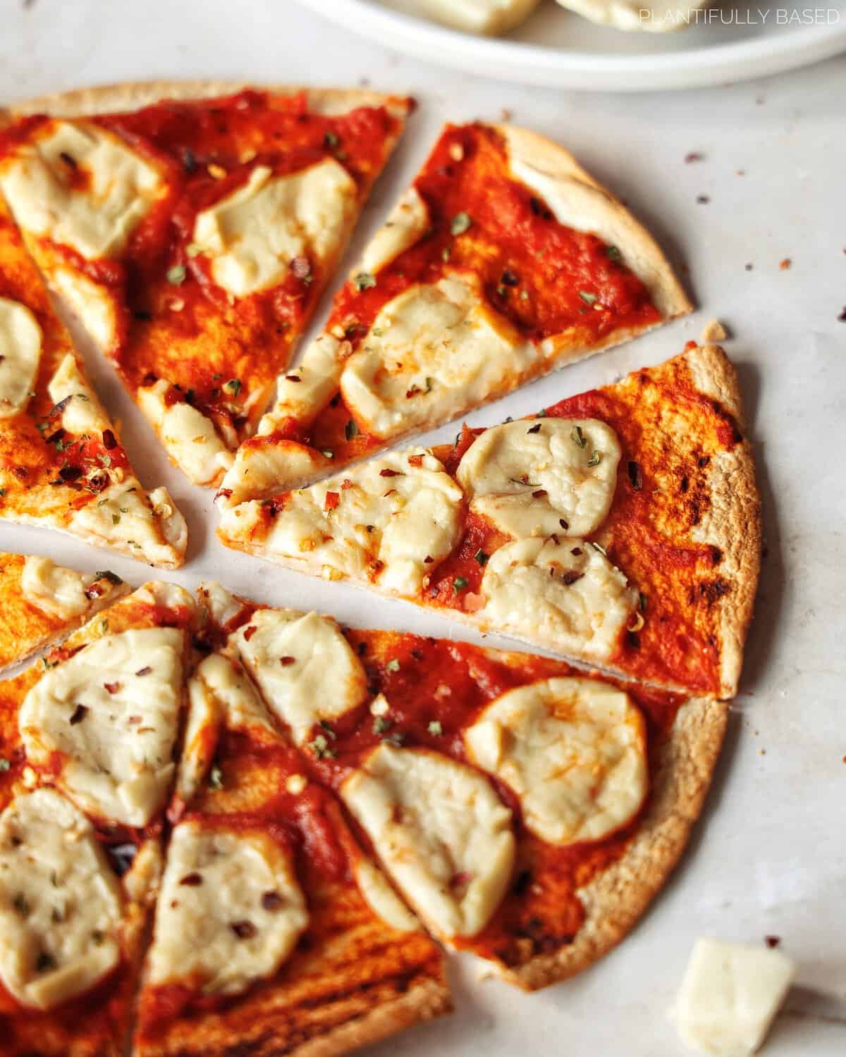 Made from boiling cauliflower and blending it with seasonings and tapioca starch. It creates a stretchy, gooey vegan cheese perfect for pizza, lasagna, and more.