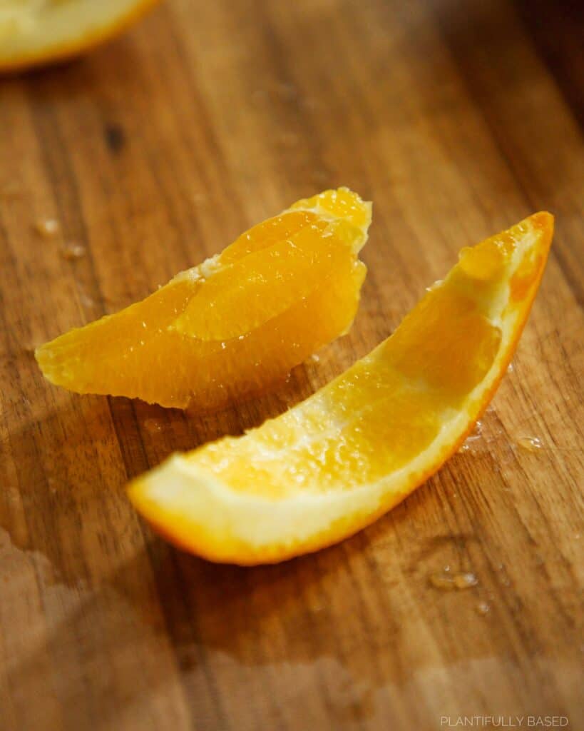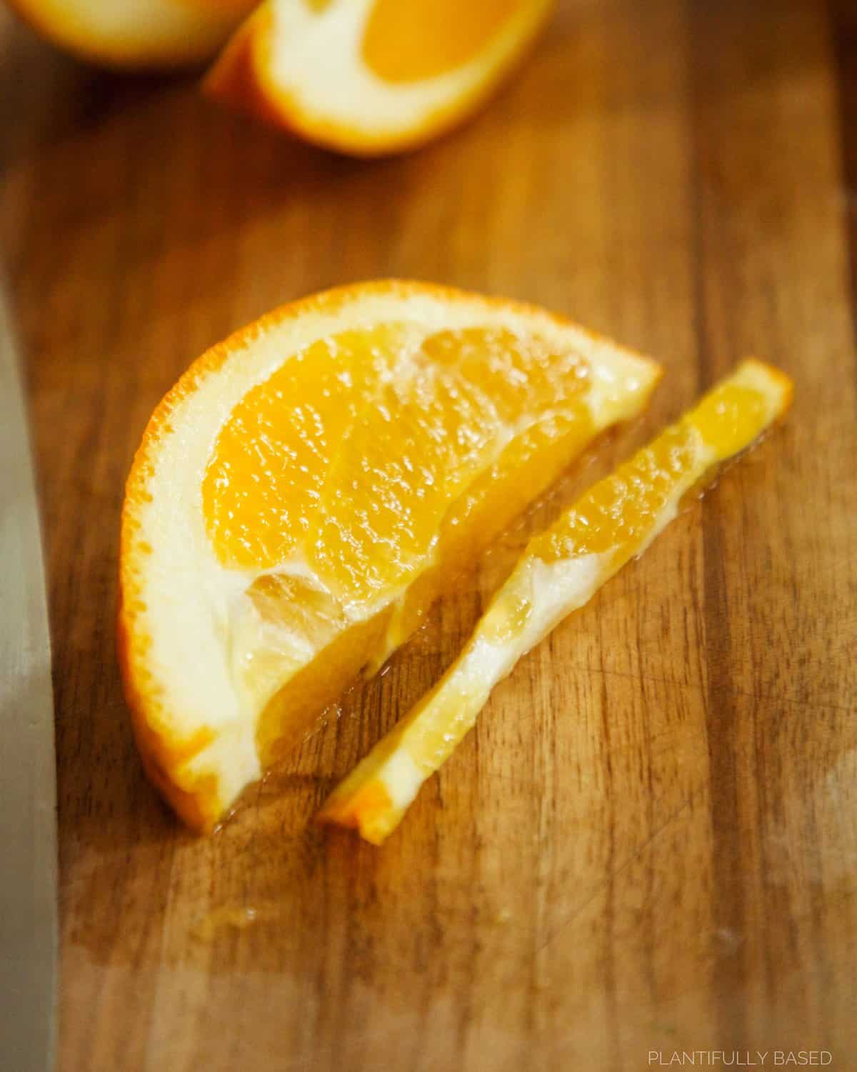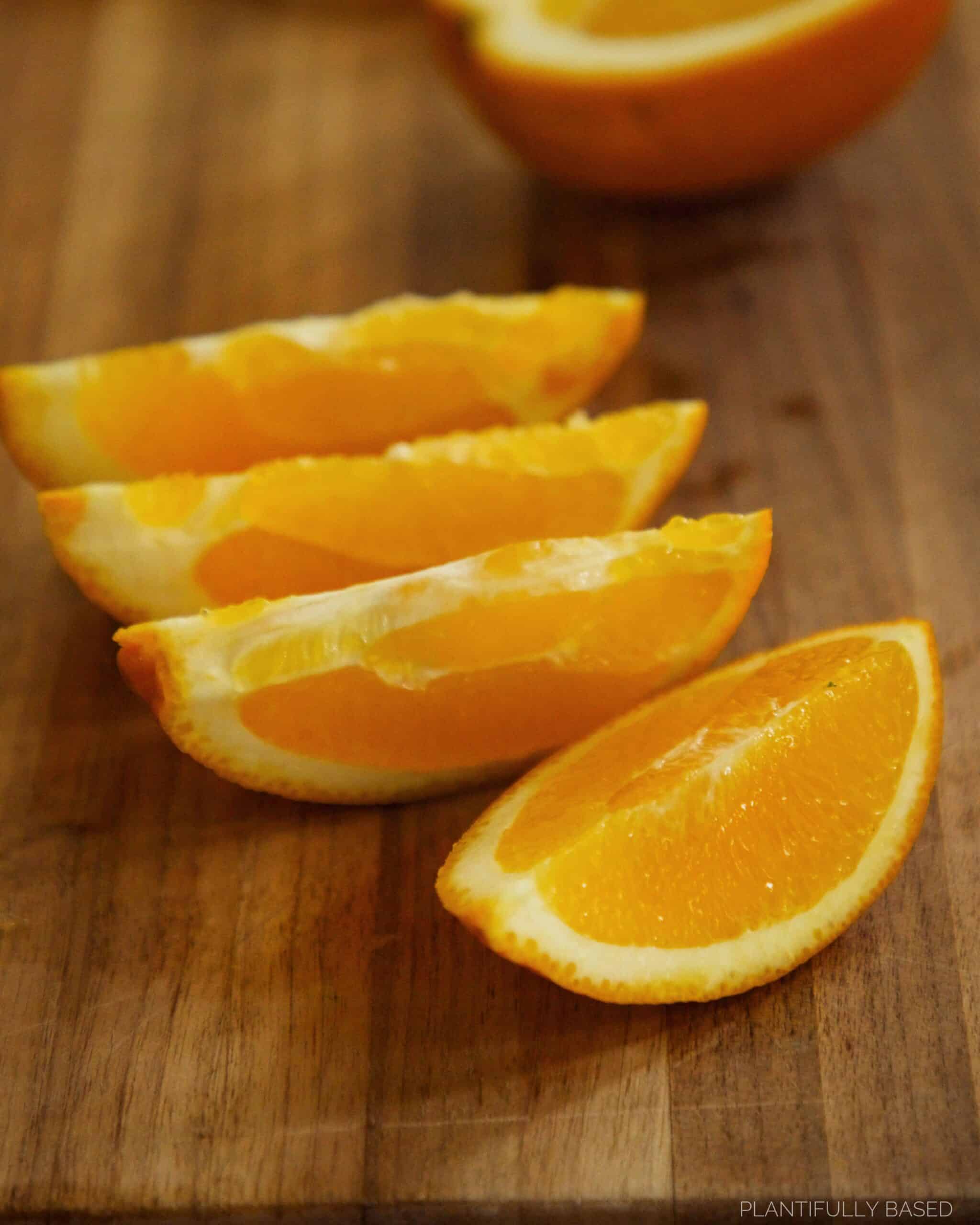 - Slice the orange in half. Then, cut the half into wedges. You want 8-10 pieces total. If there is any white or pith cut that off to remove it. Carefully, take a knife and cut between the pith and the flesh to remove an orange segment. Repeat until all pieces are done.