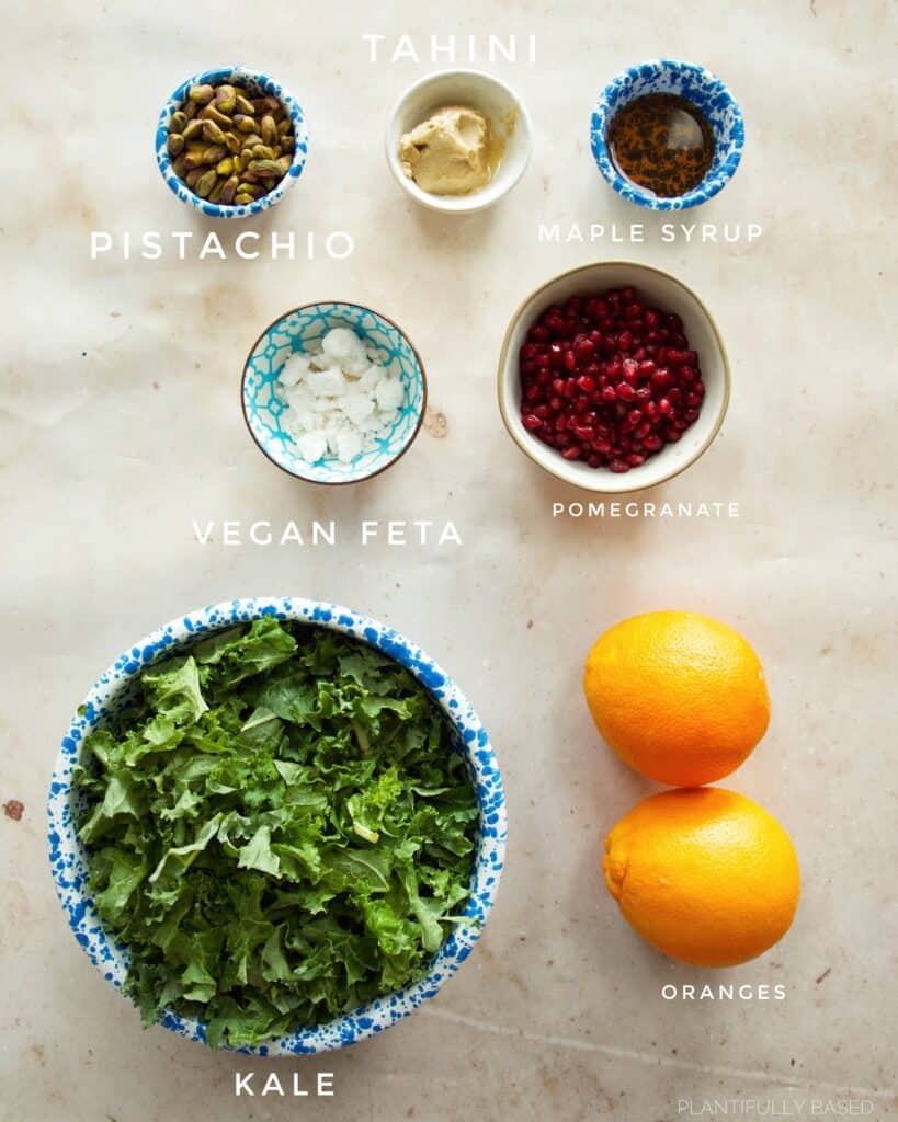 a kale orange wreath salad is the perfect holiday salad. filled with oranges, pistachios, pomegranate seeds, and vegan feta it has so much incredible flavor.