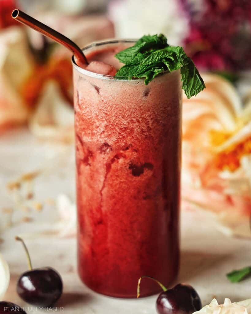 Simply pour the drink over the ice, and top it with a few fresh mint leaves. If you want to get a little fancy you can always add in some of the frozen cherries too.