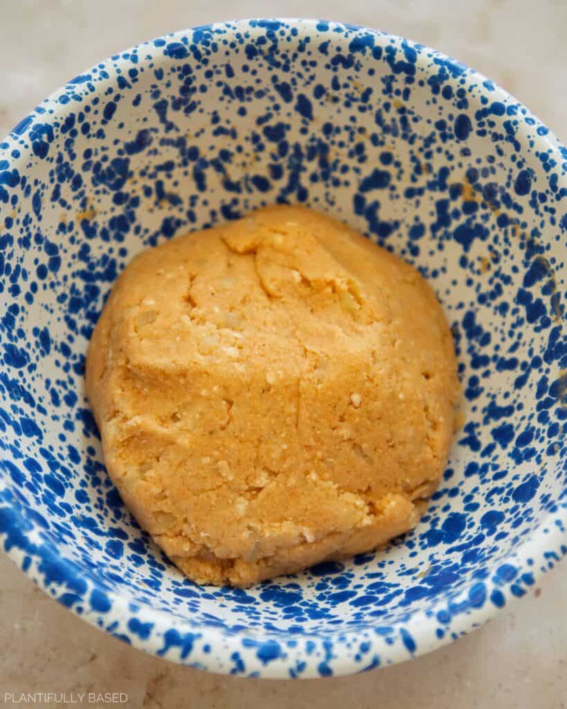 - Mix together with a spatula or spoon until it forms a dough. My breadcrumbs had paprika in it giving the dough an orange color.
