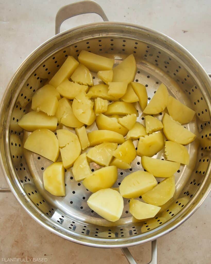 Steaming the potatoes is very important because if you boil them they will take on more water. We also don’t want to steam them for too long just enough until they are soft to mash.