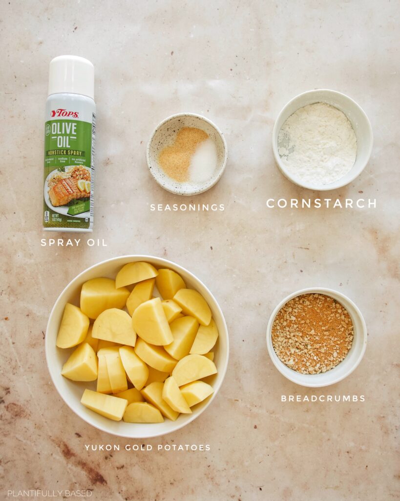 - Breadcrumbs: we will need some breadcrumbs to absorb the liquid. You can use any you like. I used a combination of my homemade seasoned ones. I just take a can of panko, blend it up with seasonings, and then pop back it in the can! Along with a little bit of just regular panko. Because my seasoned panko had paprika it gave the smiley fries a more orange color which did work well here.