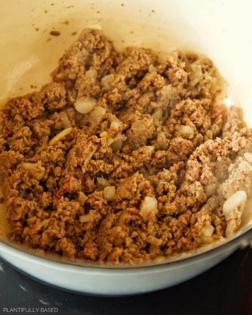 - In a medium-sized pot sauté the chopped garlic and onion over medium low heat until fragrant. Then, add in the vegan ground beef and continue to cook until browned.