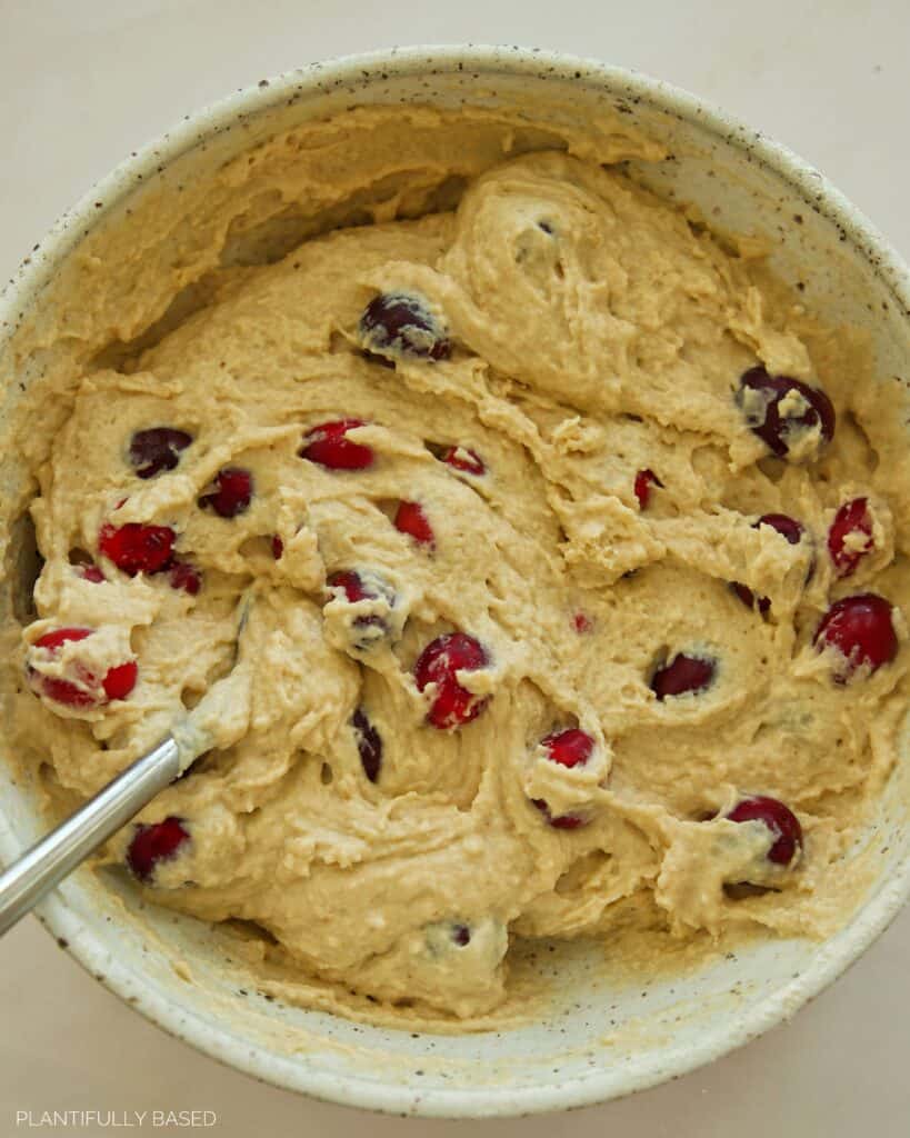 - Add in the wet ingredients: non-dairy milk, egg replacer, water, and vanilla extract. Mix to make a thick batter.