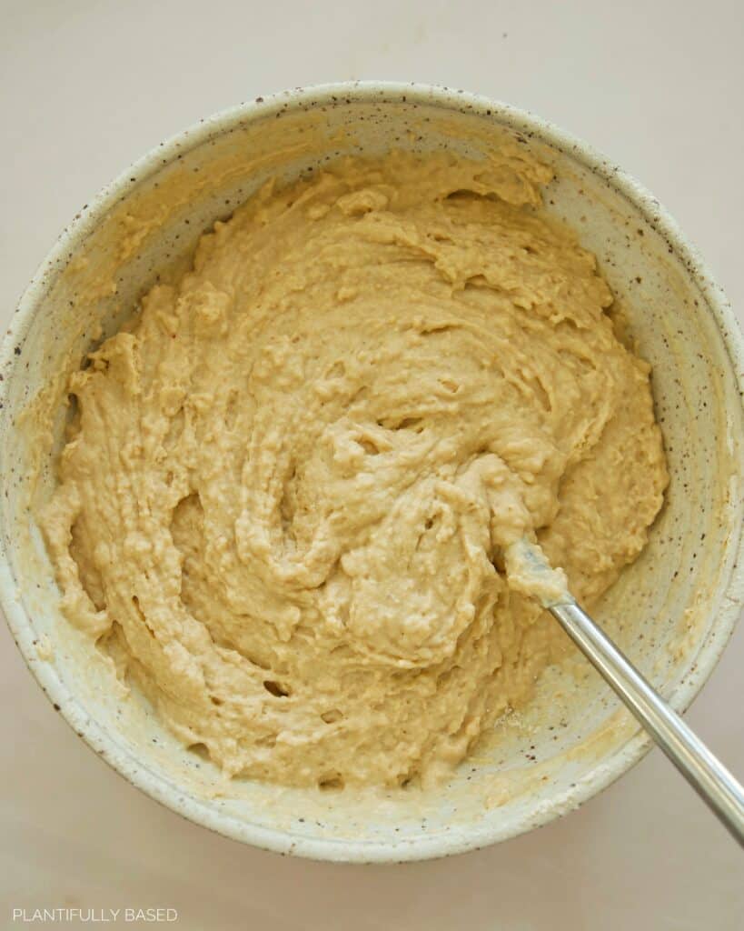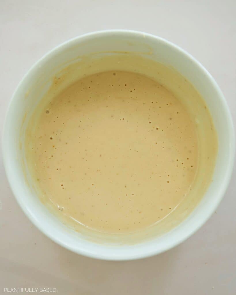 - Add in the wet ingredients: agave, non-dairy milk, and the egg replacer. You will also need to add in ½ cup of water. Mix to form a batter.
