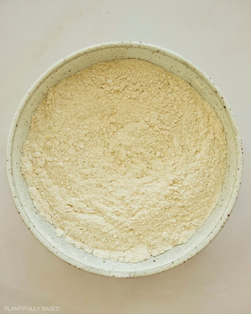 - Add all the dry ingredients: vital wheat gluten, all purpose flour, vegan vanilla protein powder, stevia in the raw, and baking powder into a large bowl. Mix to combine.