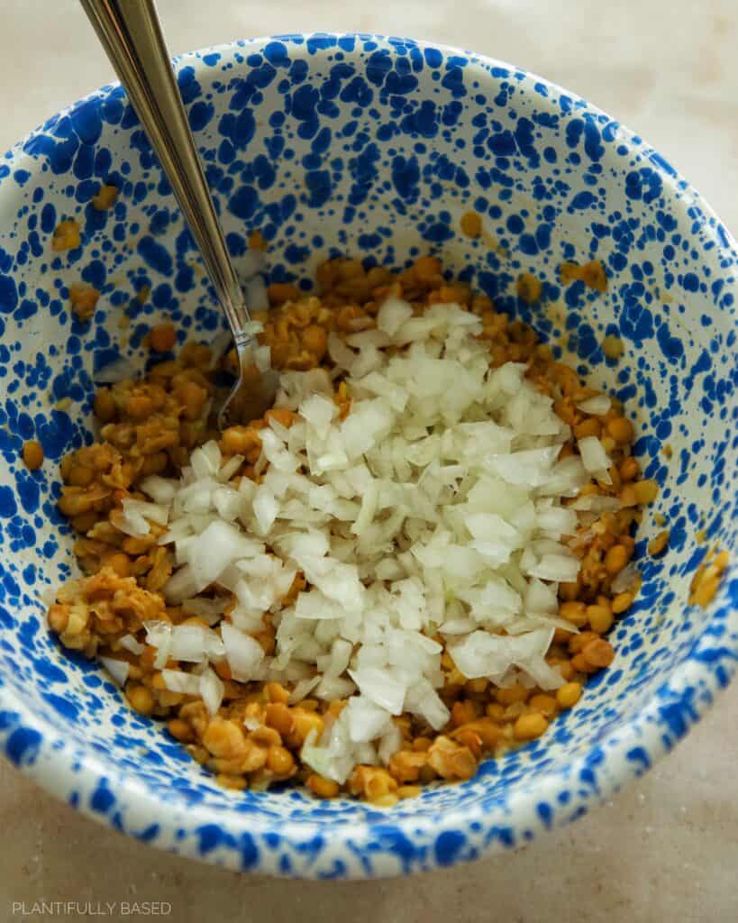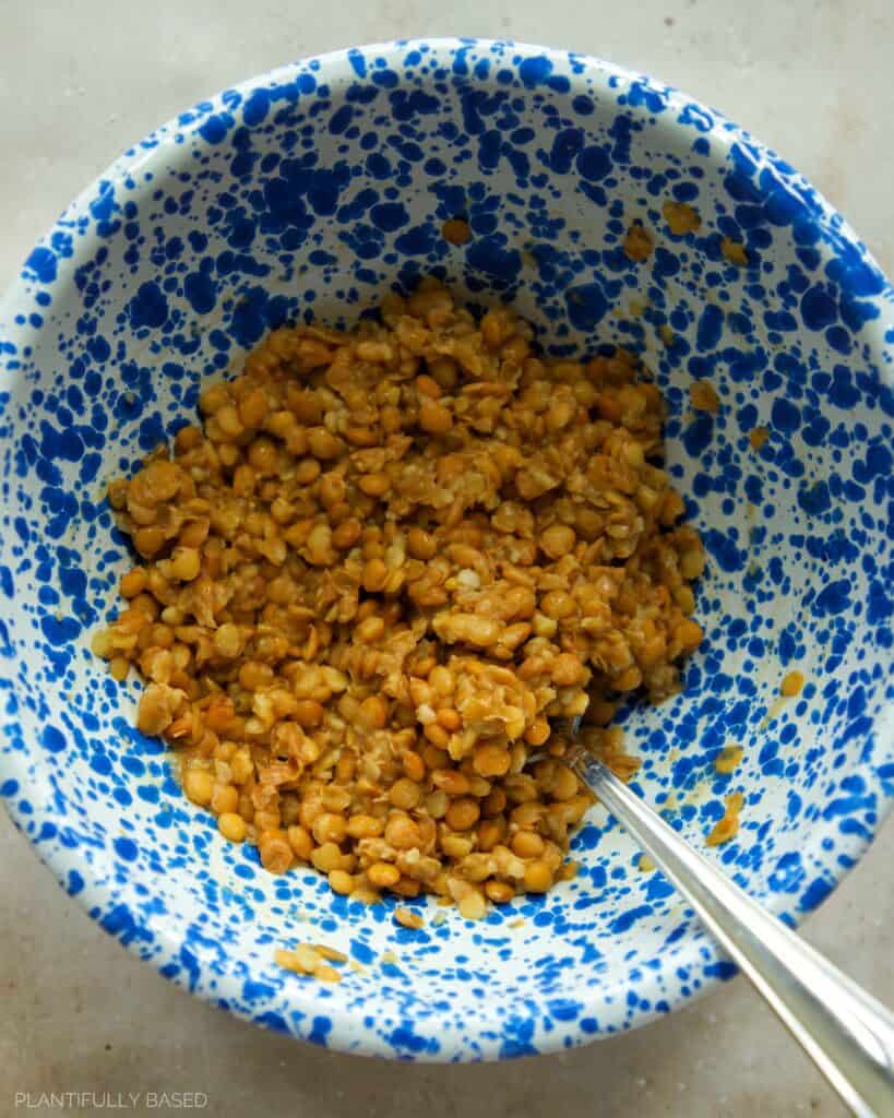 - In a large bowl mash the lentils with the back of a fork. They do not have to be fully broken down, just somewhat mashed and broken up.