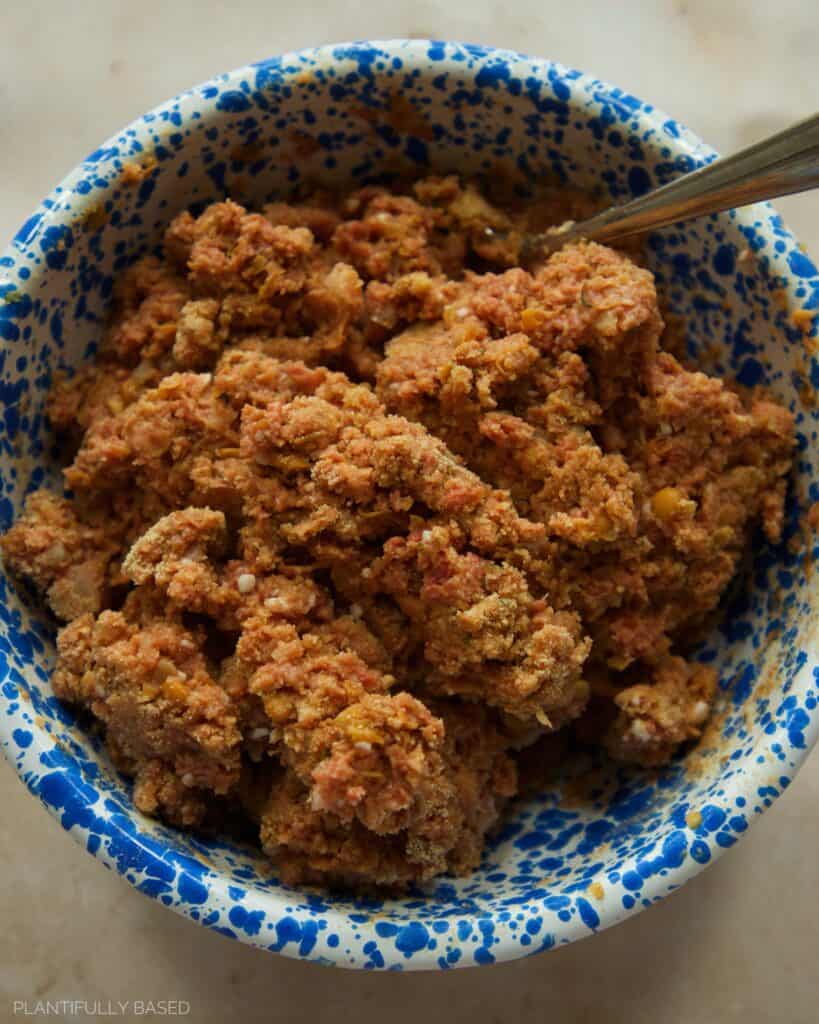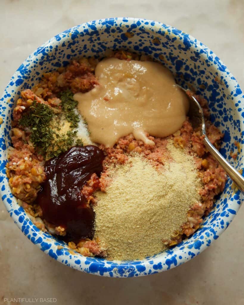 - Add in the egg replacer, barbecue sauce, breadcrumbs, and seasonings.