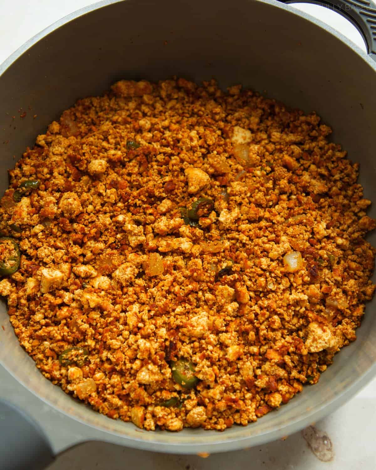 Personally, I like the tofu to have nice golden brown bits that are a little crispy. So, I cook the tofu on a bit of a higher heat to make that happen. I like to lay the tofu as flat as I can in the pan into an even layer, let it cook for a few minutes, then toss, and repeat. This will help to give the tofu crumble a chance to rotate in the pan.