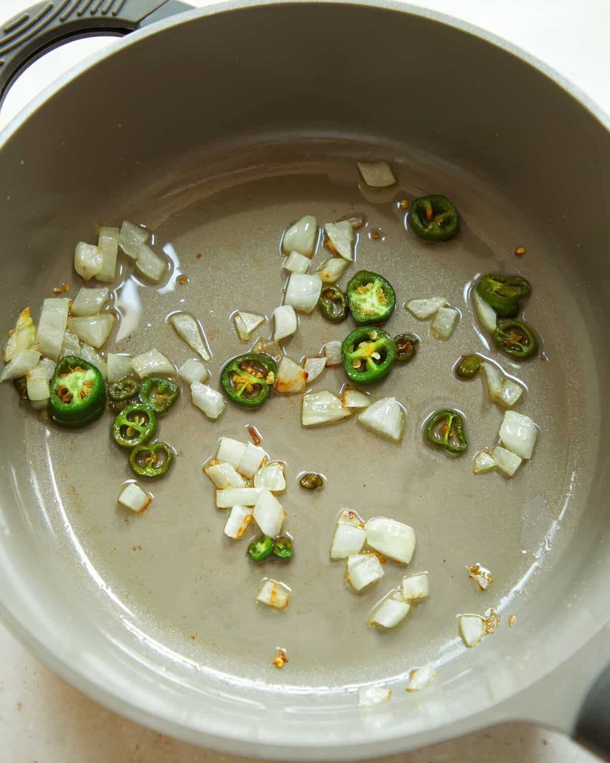 - In a medium or large pan sauté the onion and jalapeño, if using them.