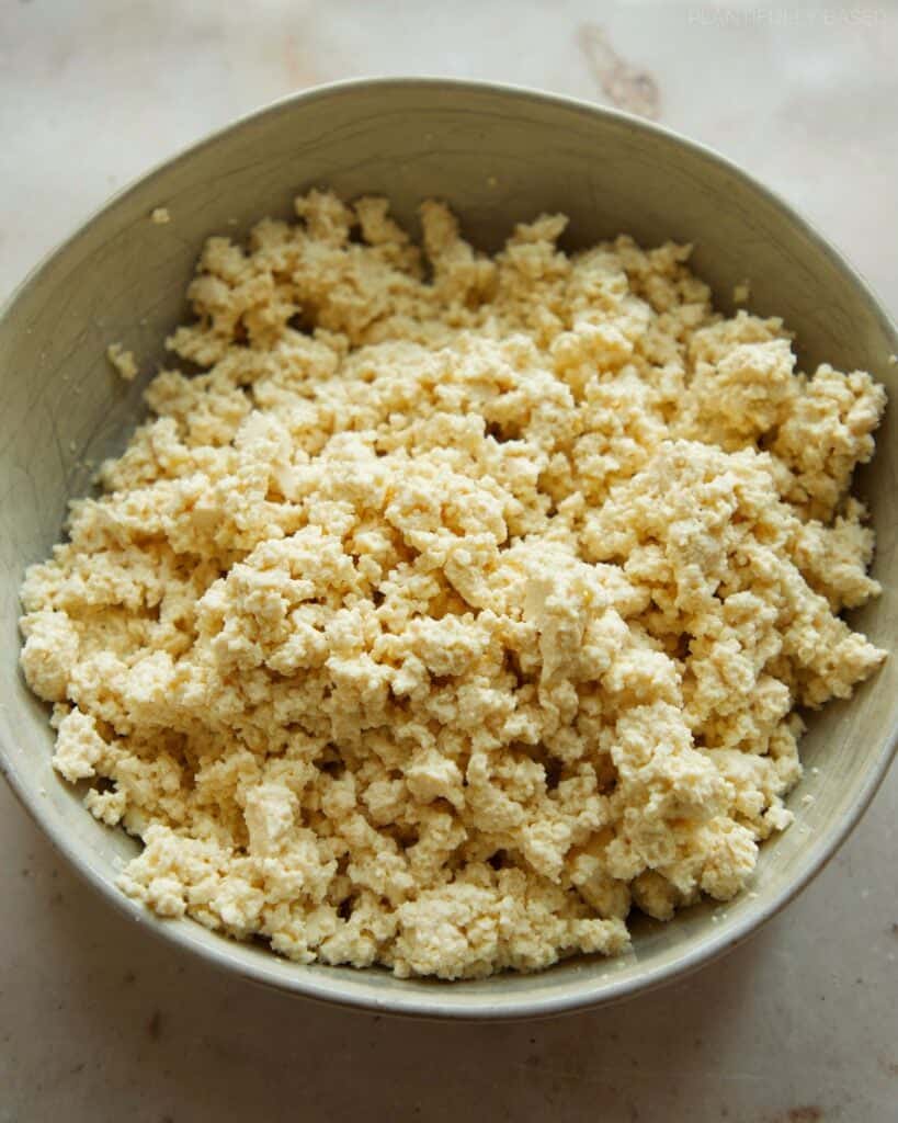 - While they are cooking crumble a block of extra firm tofu with your hands in a medium bowl.