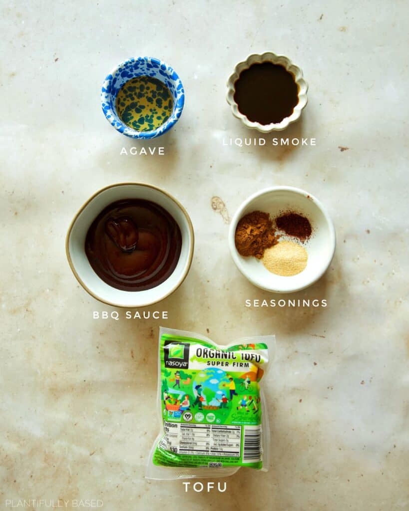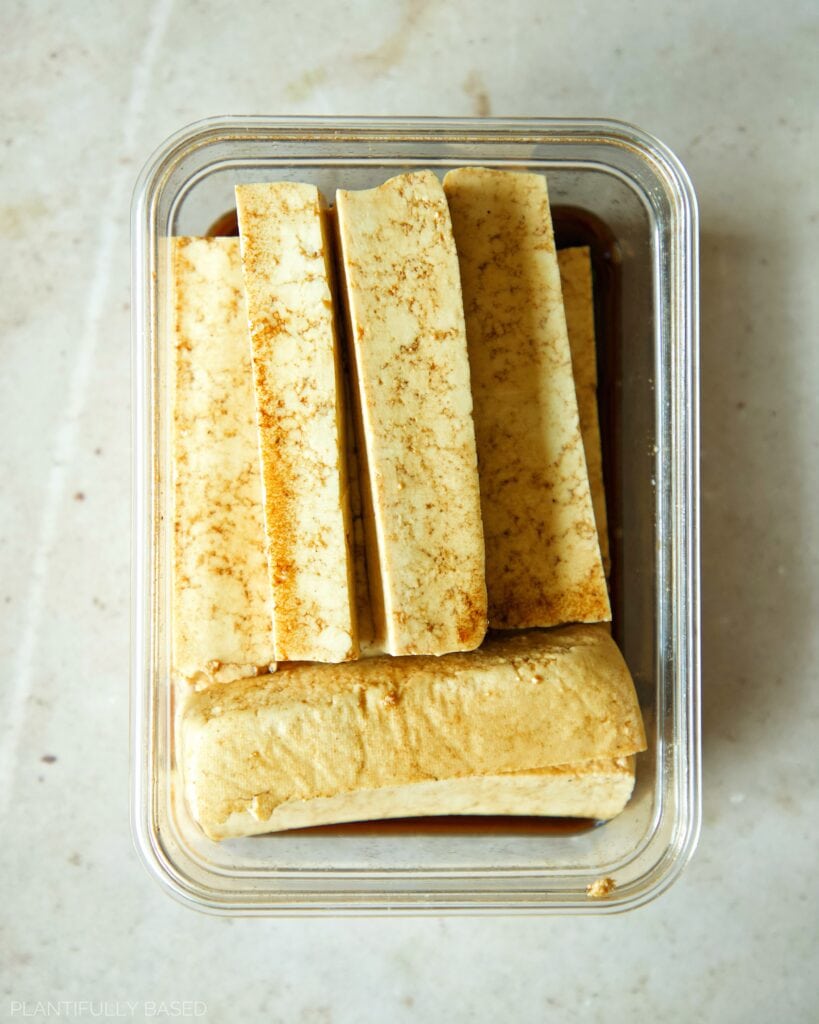 - In a container add the tofu with the 1 tablespoon of agave, liquid smoke, and 2 to 3 tablespoons of water. Marinate the tofu for at least 20 to 30 minutes. However, you can marinate the tofu for up to 8 hours in the fridge.
