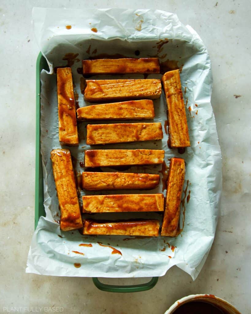 After the tofu is done marinating it will be time to start preparing the vegan ribs! You need to take a parchment lined baking sheet and place the tofu on there.