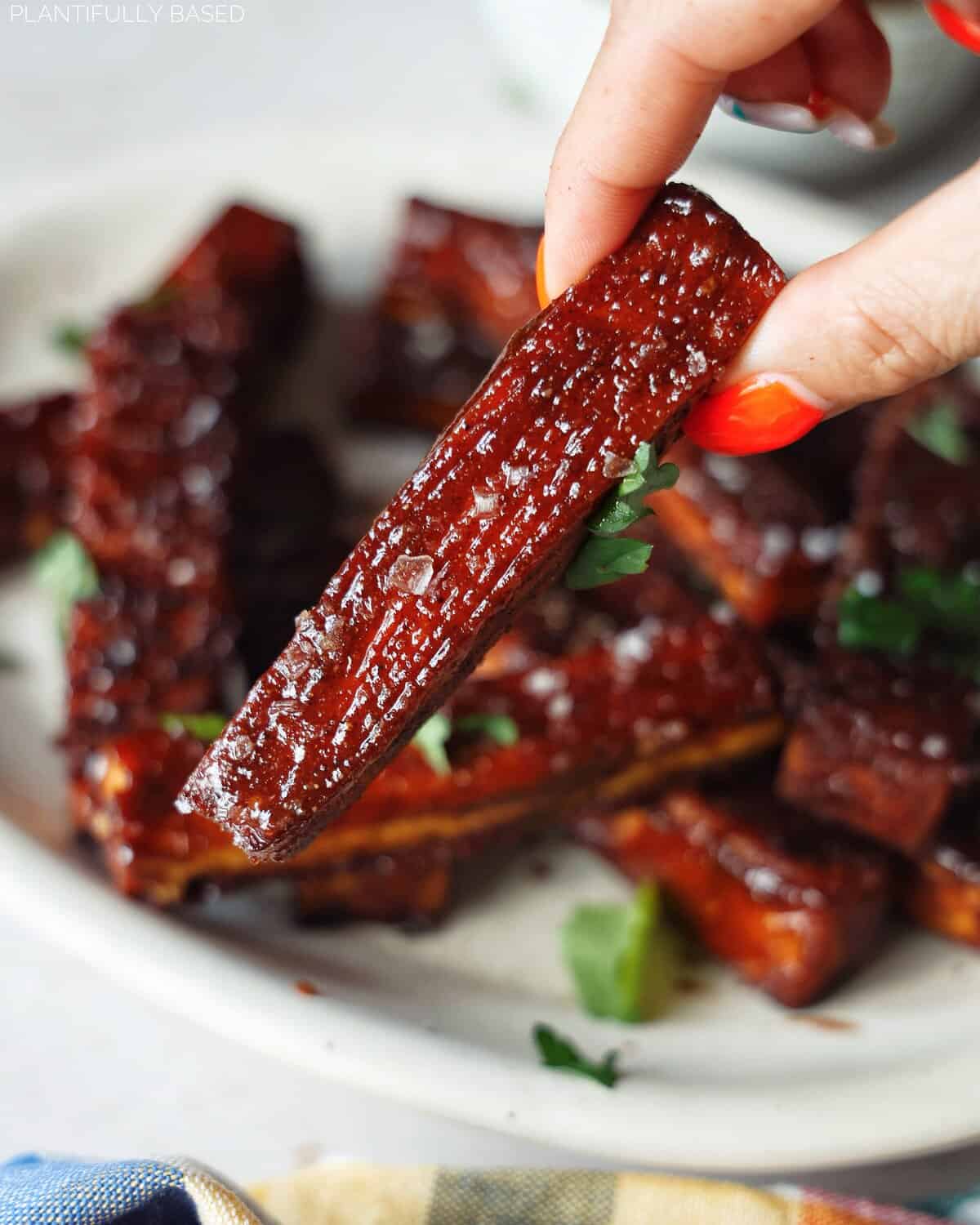 Cutting the tofu into long rectangles creates nice pieces to bit into and giving it a similar shape to ribs (without the actual ribs of course!) I still wanted to create something full of flavor and packed with BBQ goodness!