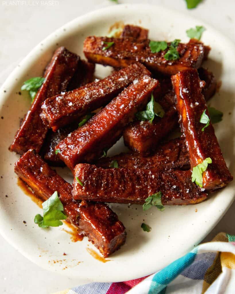 with summer right around the corner it is a great time to make these easy vegan bbq ribs! made with tofu and baked in the oven, these are perfect for anytime of year.