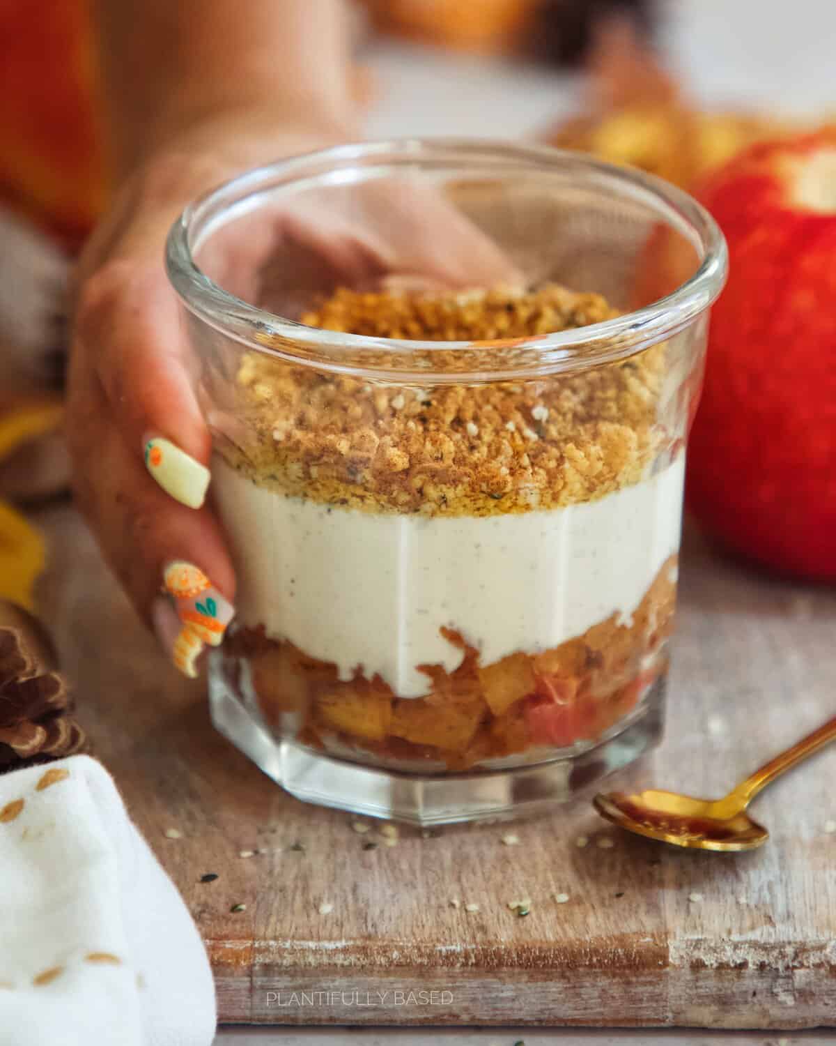 Now once you have made all the components for the apple pie yogurt bowl ready it is time to make it! Obviously, for my pictures I did actually decide to go with a large jar but it can also go in a bowl. Any vessel you want to put it in will work great here.