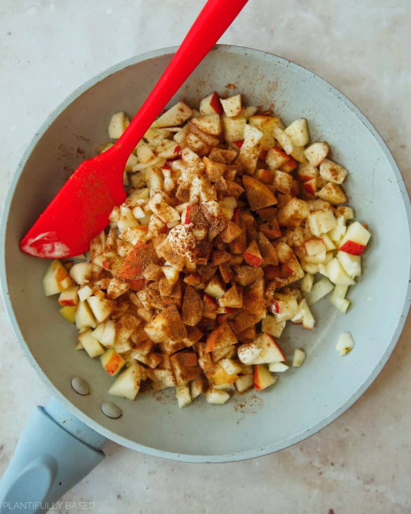- Place the apples into a small pan. Add in some vegan butter, ground cinnamon, ground nutmeg, vanilla extract, and agave.