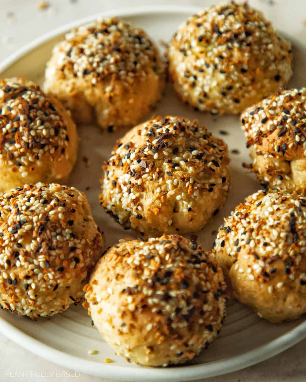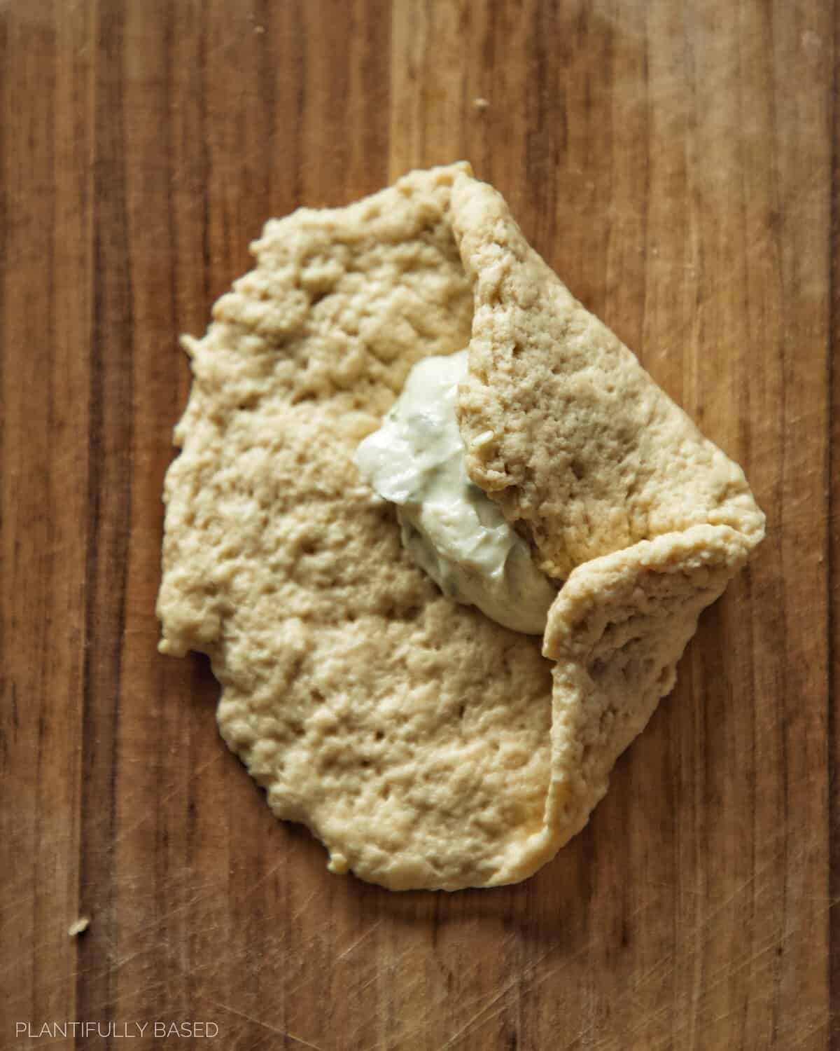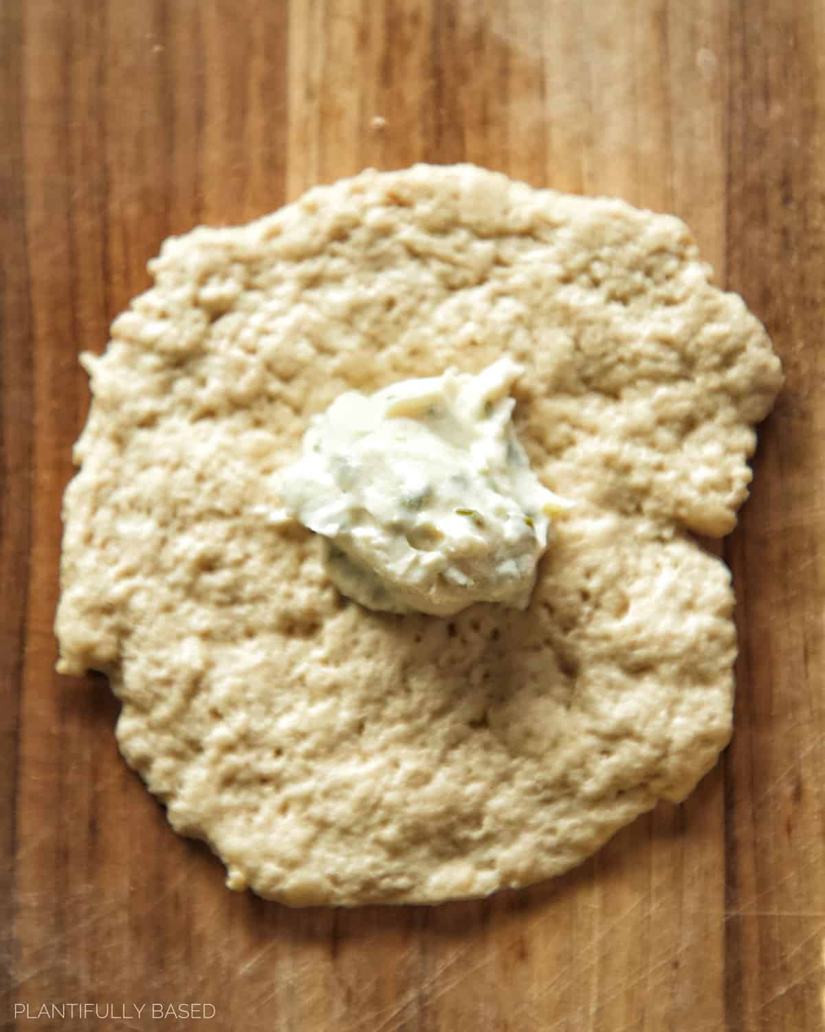 - Use your hands to flatten out the dough into about a 4 to 5 inch circle. Then scoop about 2 teaspoons (10g) of the vegan cream cheese into the middle of the dough. Use your hands to pull up the sides of the circle over top of each other. Then pinch the dough to seal it and roll into a ball. Dip and roll in the everything bagel seasoning if desired and place on a lined baking sheet. Repeat the process until all have been made.