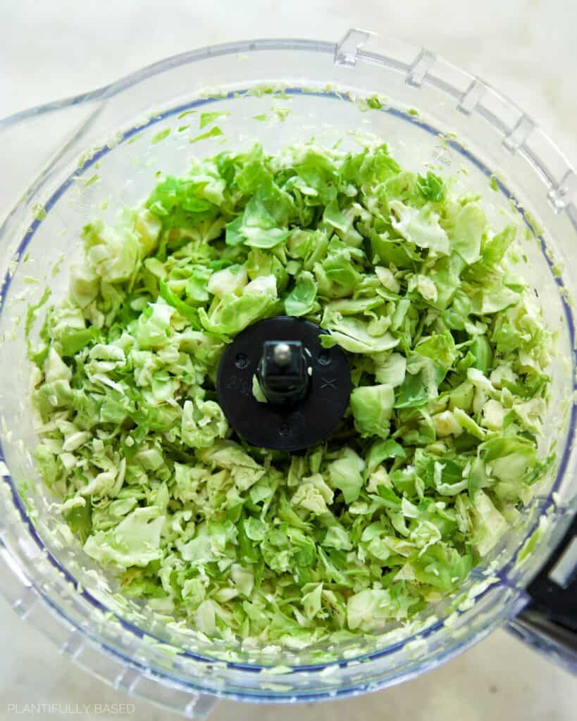 - Then, put them all in a food processor and pulse until they are shaved Brussels sprouts. It should take 30 seconds to 1 minute