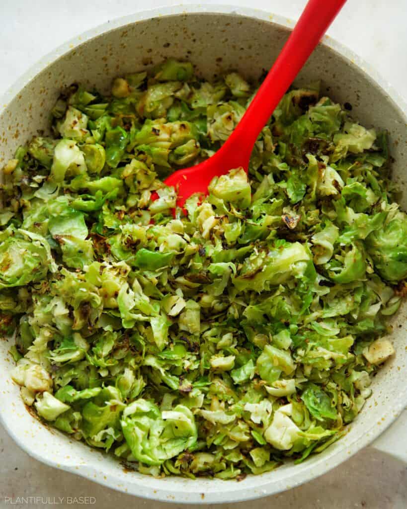 Alternatively, if you want to serve the shaved Brussels sprouts salad warm you can make the dressing, grate the vegan parmesan, and shave the Brussels sprouts ahead of time. Keep the dressing and vegan parmesan stored in a container. You can also shred the Brussels sprouts in the food processor and then keep them stored in the fridge. Then, right before eating finish the cooking and plating steps.