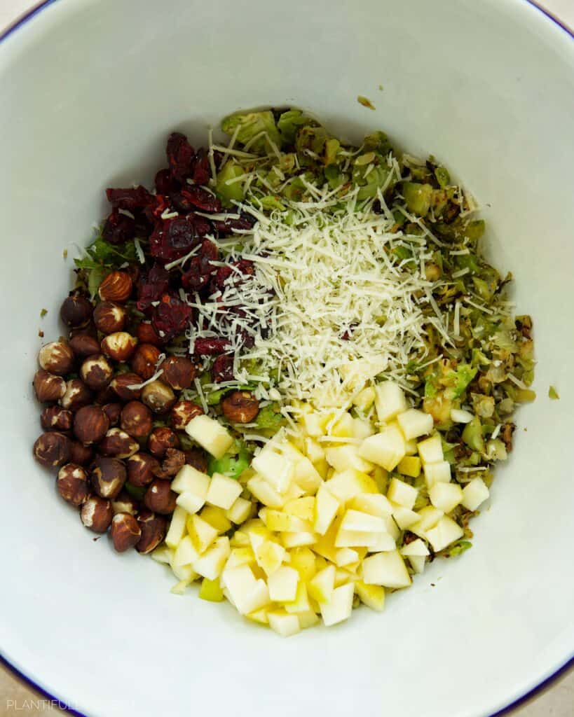 - Once the Brussels sprouts are done cooking add them into a large bowl. Then, add the hazelnuts, chopped apples, craisins, grated vegan parmesan, and half of the salad dressing. Toss to coat everything well. I personally like to leave a little of the hazelnuts, craisins, and apples aside to sprinkle over top/