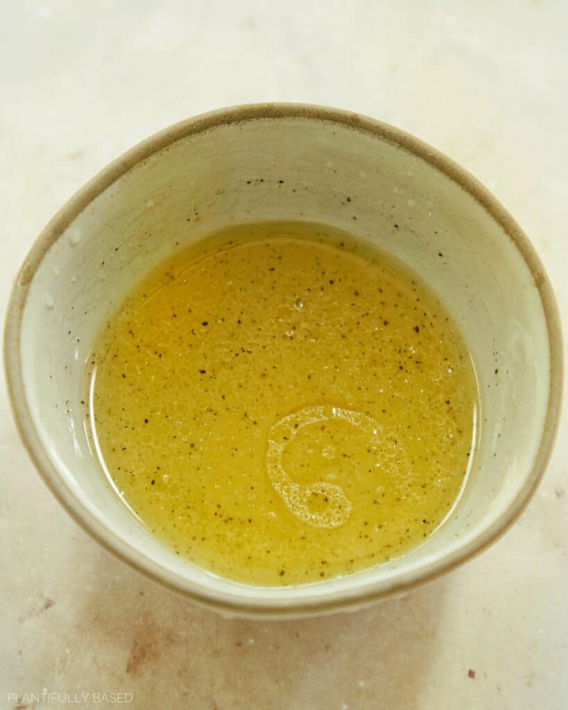 - In a small bowl prepare the dressing. Mix the lemon juice, olive oil, agave. I like to do this with a whisk. Then, add salt and black pepper to taste.