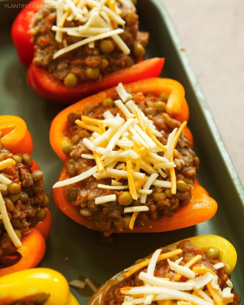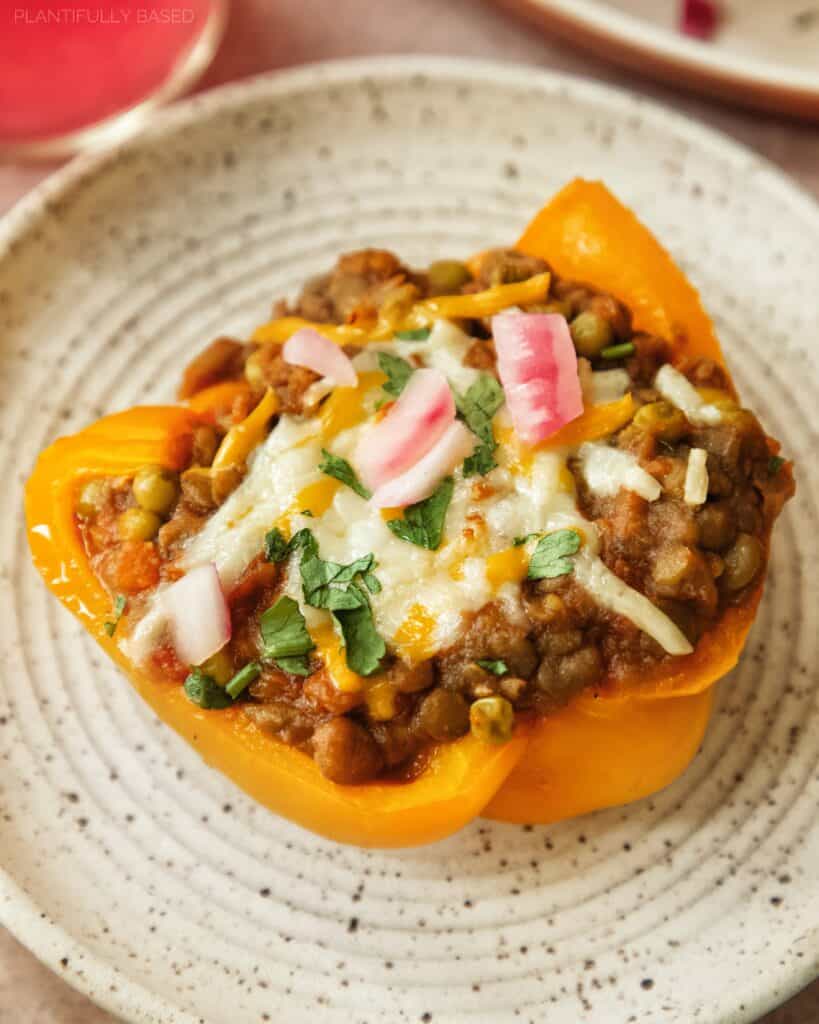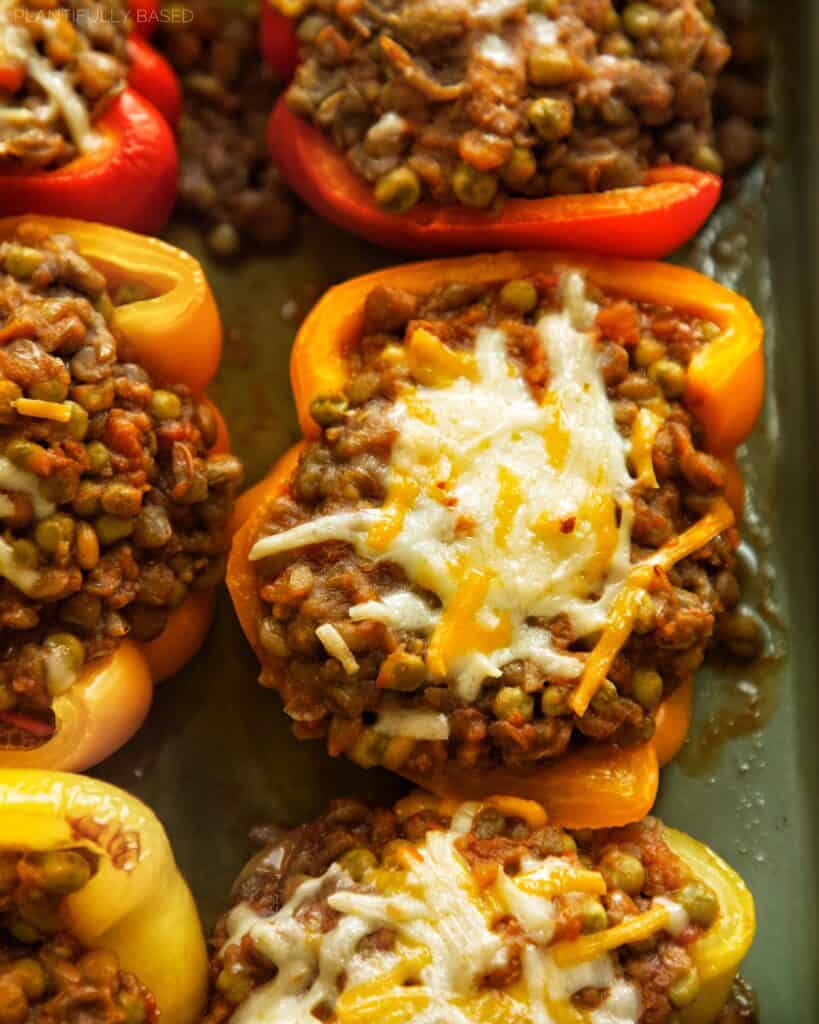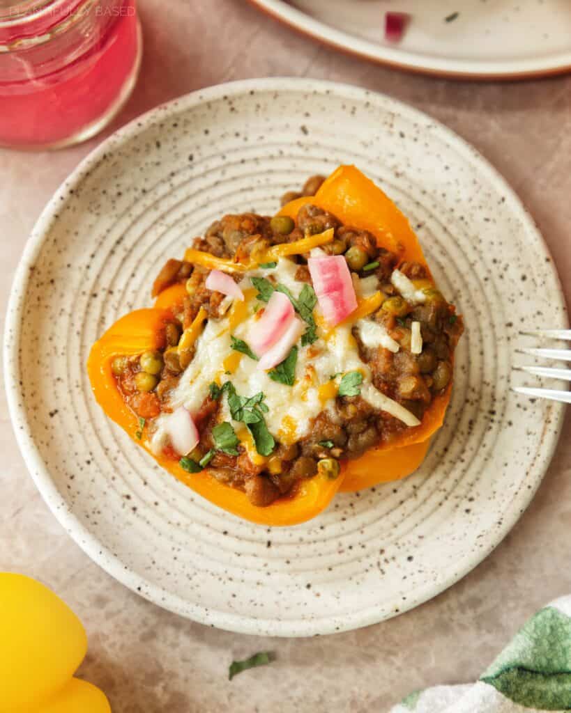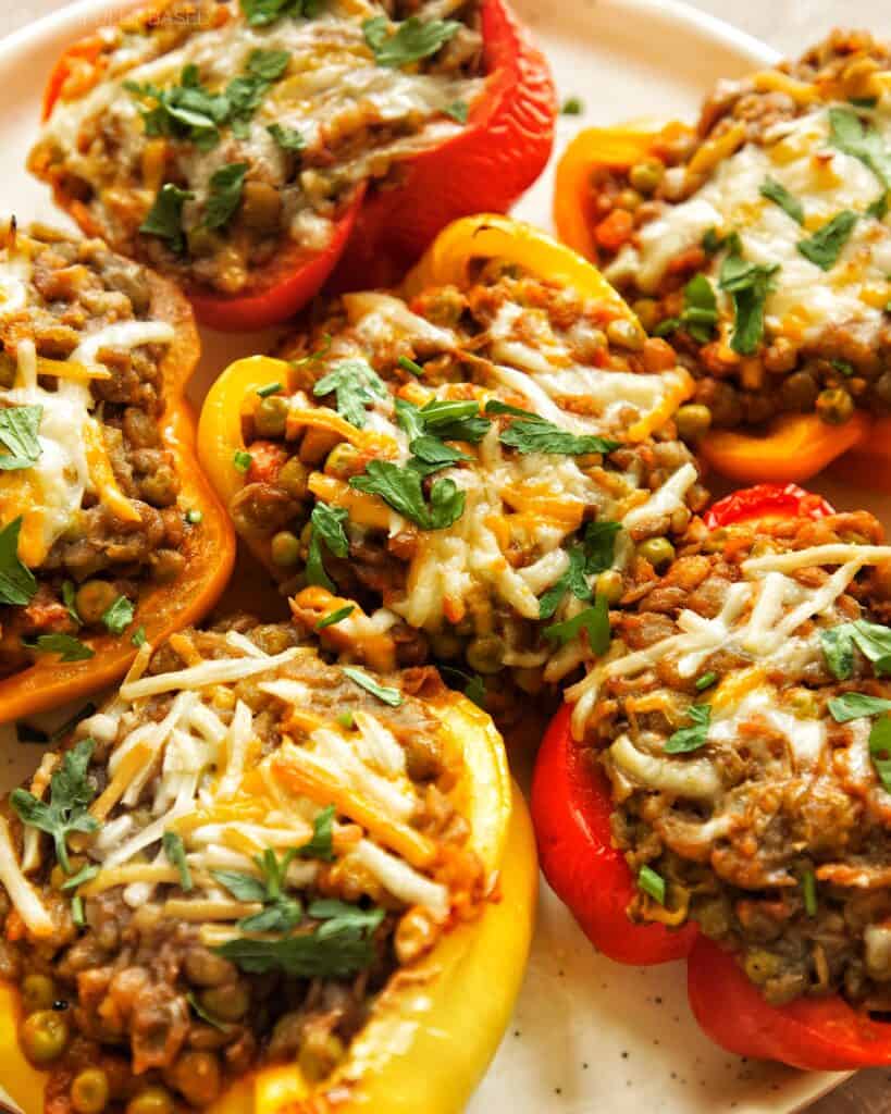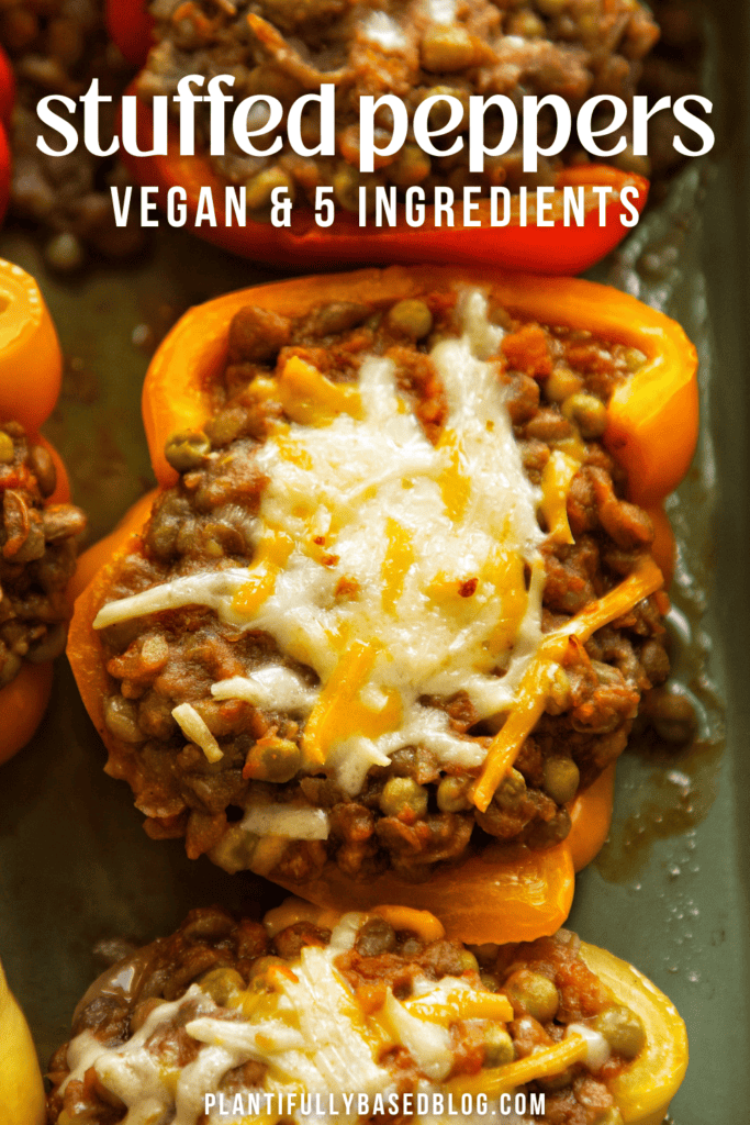 There are so many reasons to love these vegan stuffed peppers. They are so filling. I think it is a recipe that feels like comfort food but it is actually pretty healthy! We are packing it with fiber and nutrients from the lentils, peas, and bell peppers.