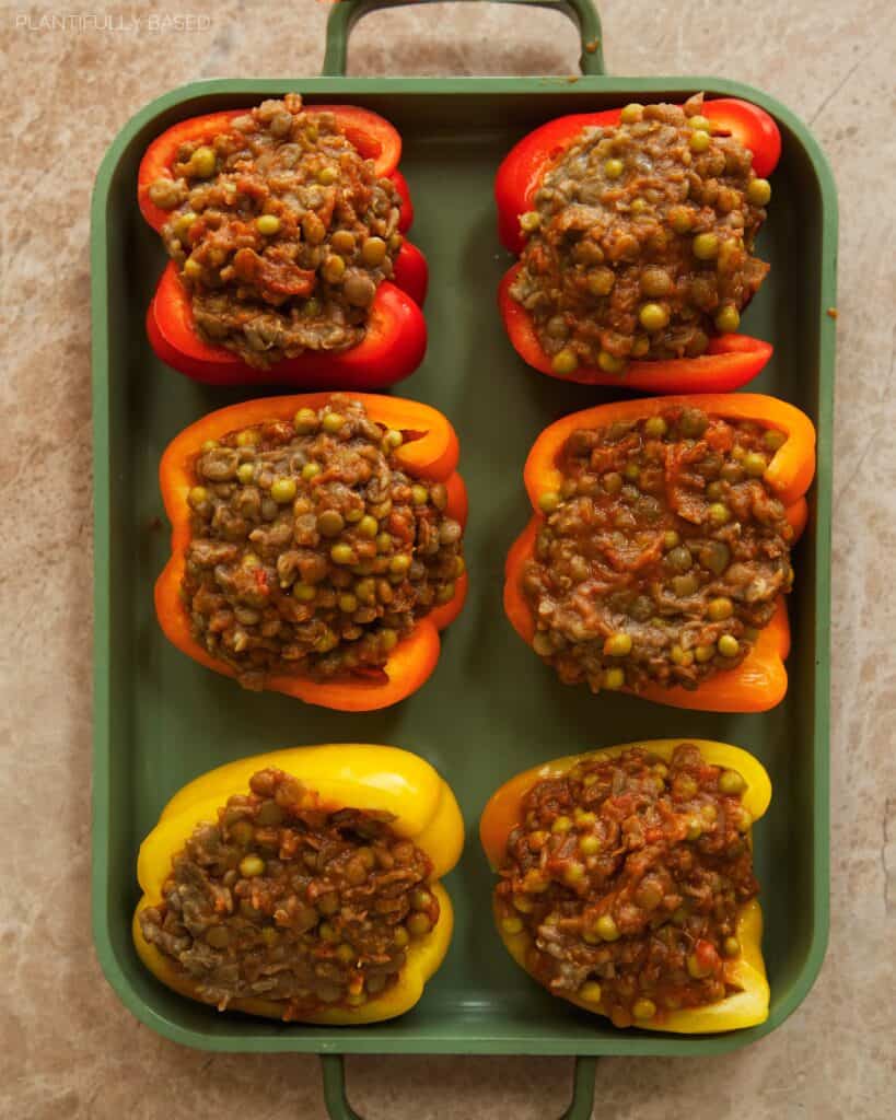 These vegan stuffed peppers are truly so delicious. They have so much flavor. The peppers become soft and sweet in the oven. The lentil filling mixture just melts right into them. So, really you don’t need to do very much here.