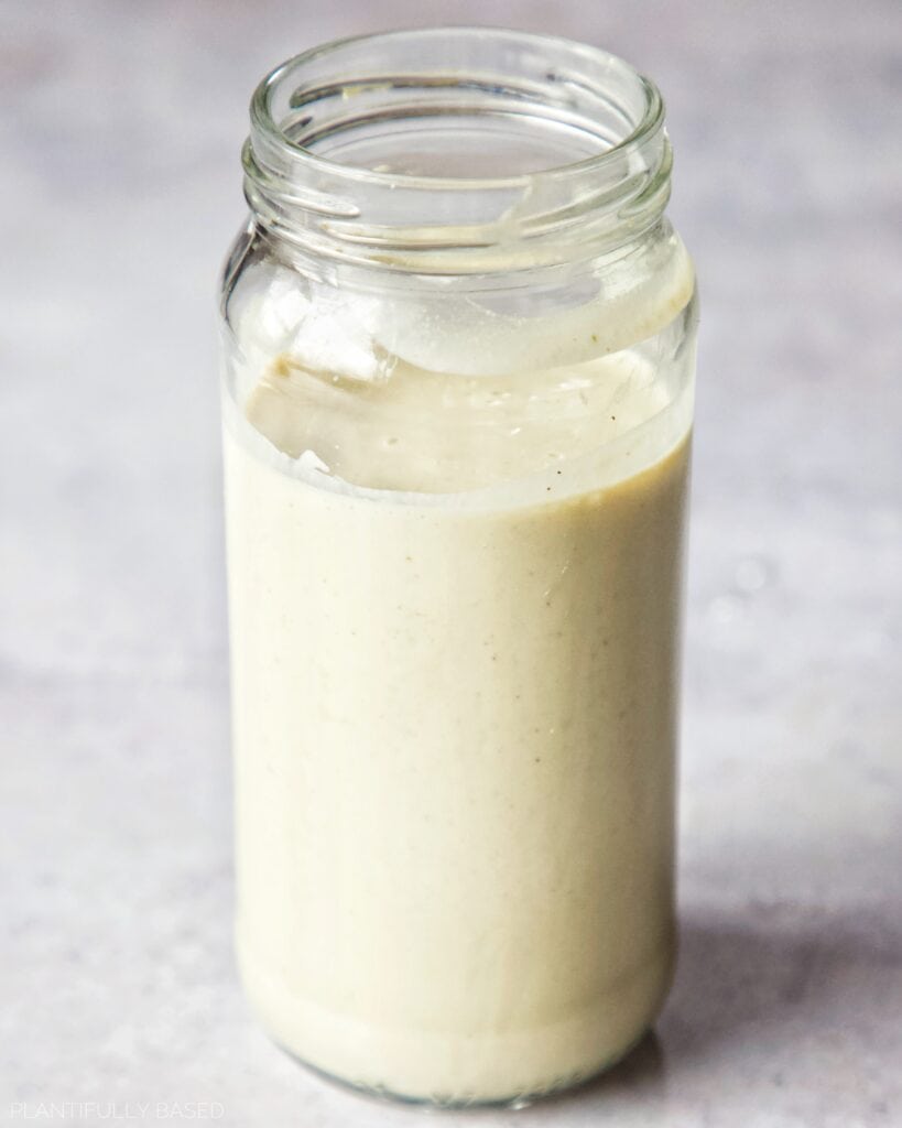 Once the dressing is all done I like to pour it into a big jar. I do this so I can keep it on hand in the fridge. However, if you are making a salad right away you can just of course pour it right over top of your salad.
