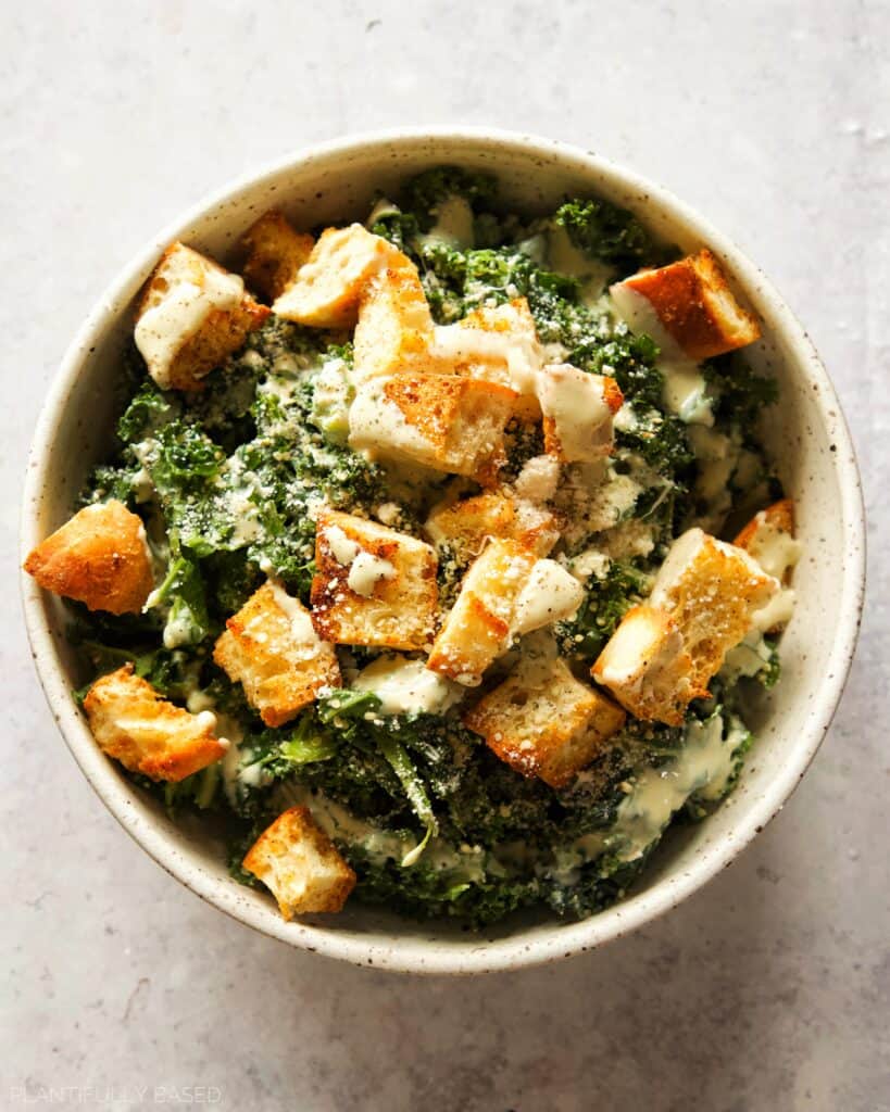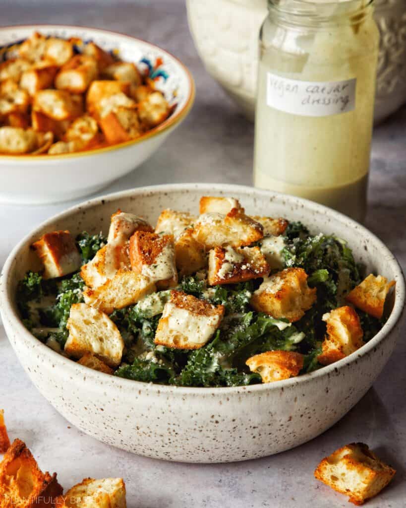 Of course the most obvious way to use a vegan Caesar salad dressing is to make a salad with it! There are so many Caesar salad variations now. For the vegan Caesar salad you see in these pictures I used: