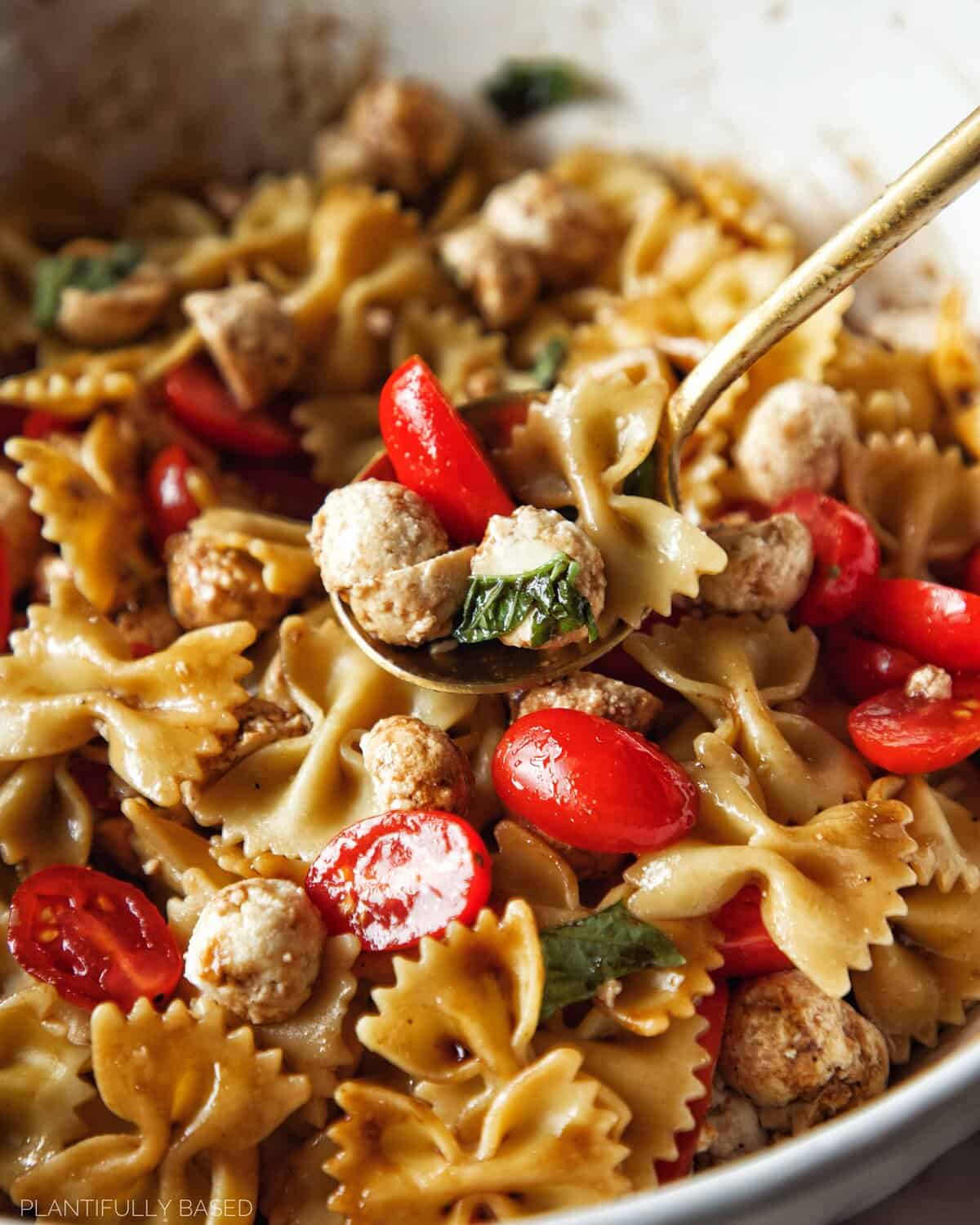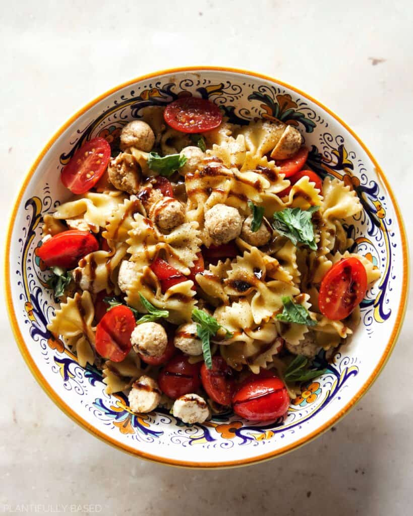 - Meanwhile, in a large bowl add the tomatoes, vegan mozzarella balls, and basil. Once pasta is cooled add that along with the oil, balsamic glaze and vinegar.
