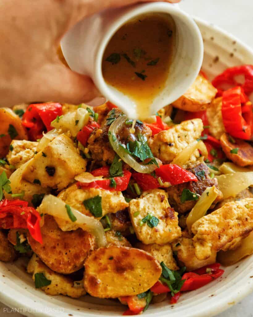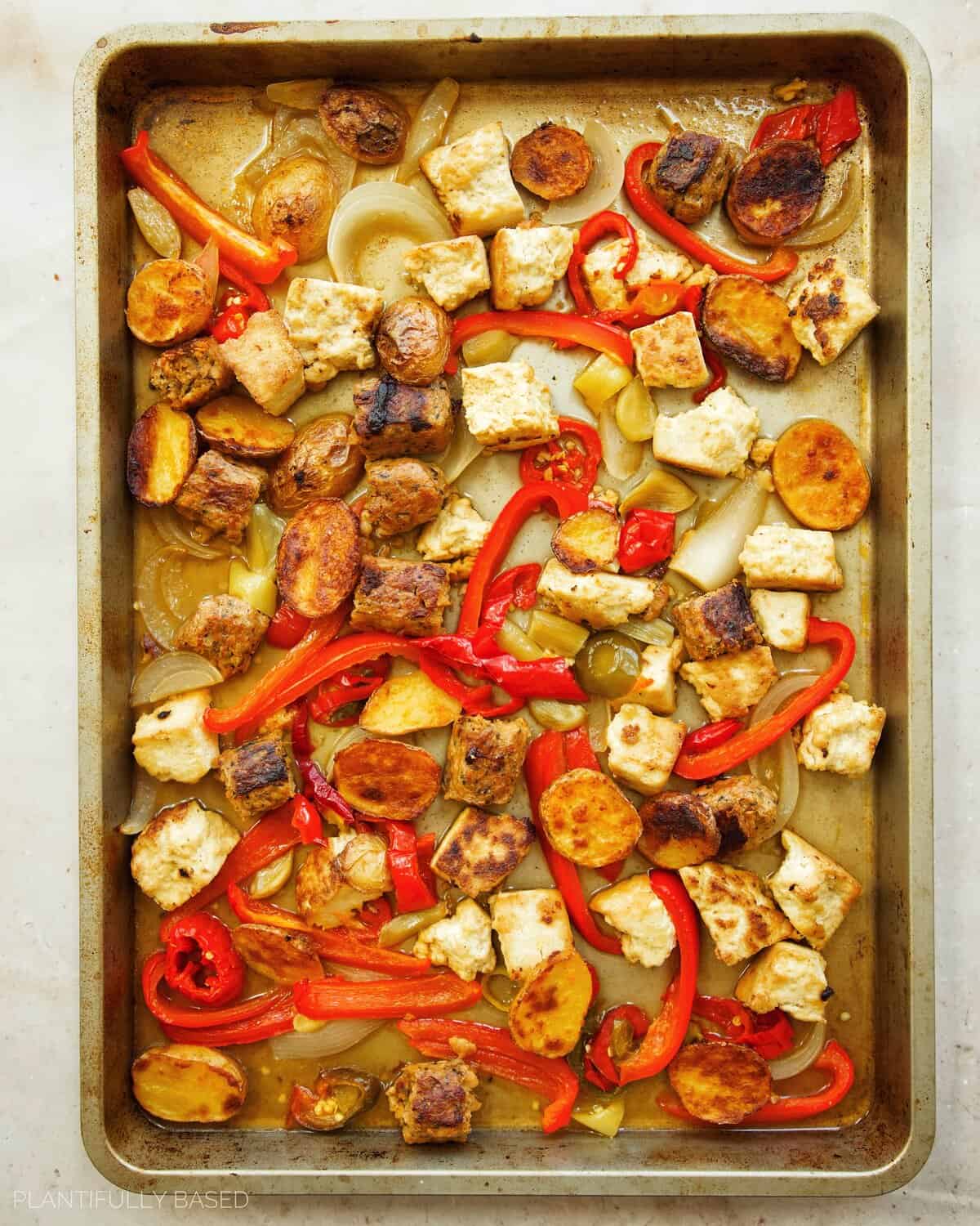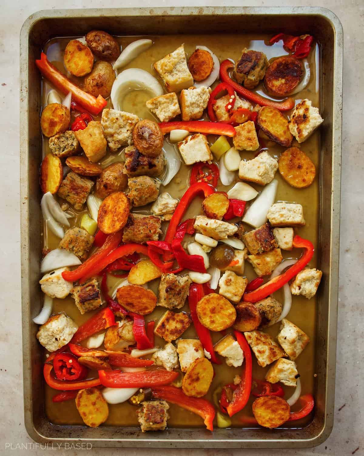 - On a large sheet pan, combine roasted potatoes (optional if you want them to stay crispy do not add them), vegan sausage, tofu, and veggies. You can slice the vegan sausage or leave it whole. Pour sauce evenly over everything.