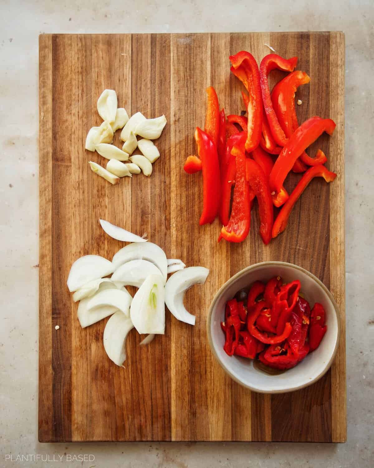 - Prep the veggies. Slice the bell pepper and onion. Leave the garlic cloves whole. If using sliced cherry peppers no need to do anything. If you are using whole cherry peppers then slice them.