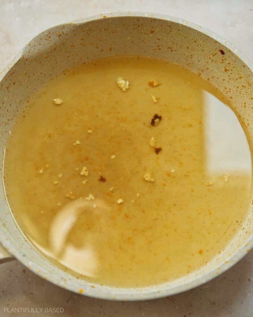 - Finally, remove the tofu from the pan. On the stove cook the vegan chicken broth, white wine vinegar, and lemon juice for 5 minutes. Bring to a simmer.
