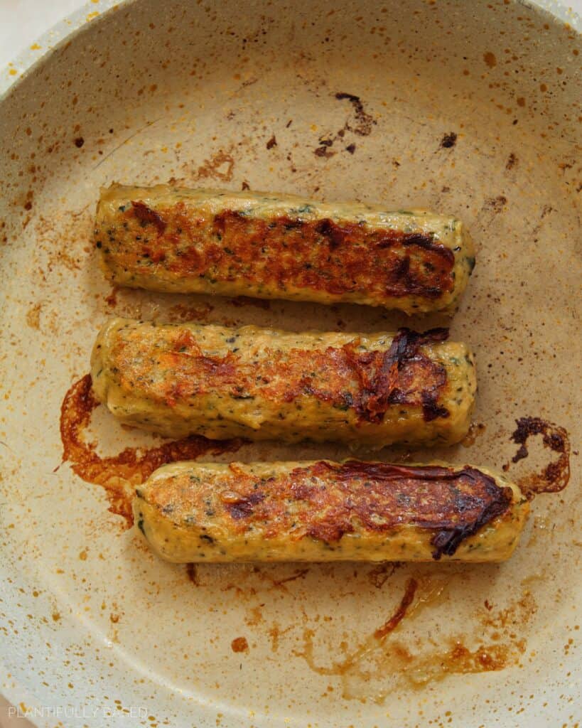 - In the meantime sear the vegan sausage in the pan, leaving behind any brown bits for flavor.