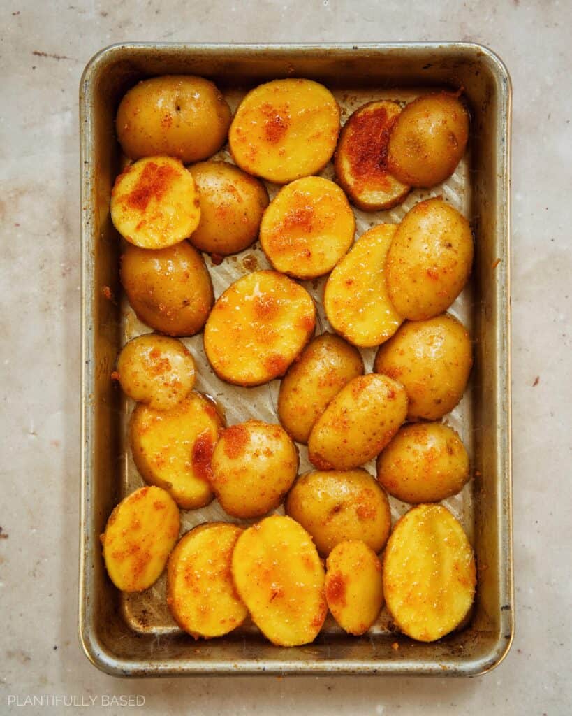 - Slice the baby potatoes into thirds or quarters. Toss in olive oil, salt, garlic powder, onion powder, and paprika. Roast in the oven for 25 minutes until golden.
