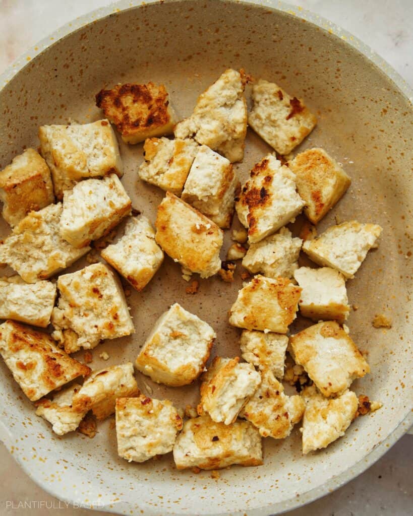 - Cook the tofu: Add a tablespoon of olive oil to the same pan. Break the tofu in pieces by hand, season with about ¼ teaspoon of salt, and cook over medium heat for 10 minutes, stirring occasionally until golden and crispy. Remove from pan.