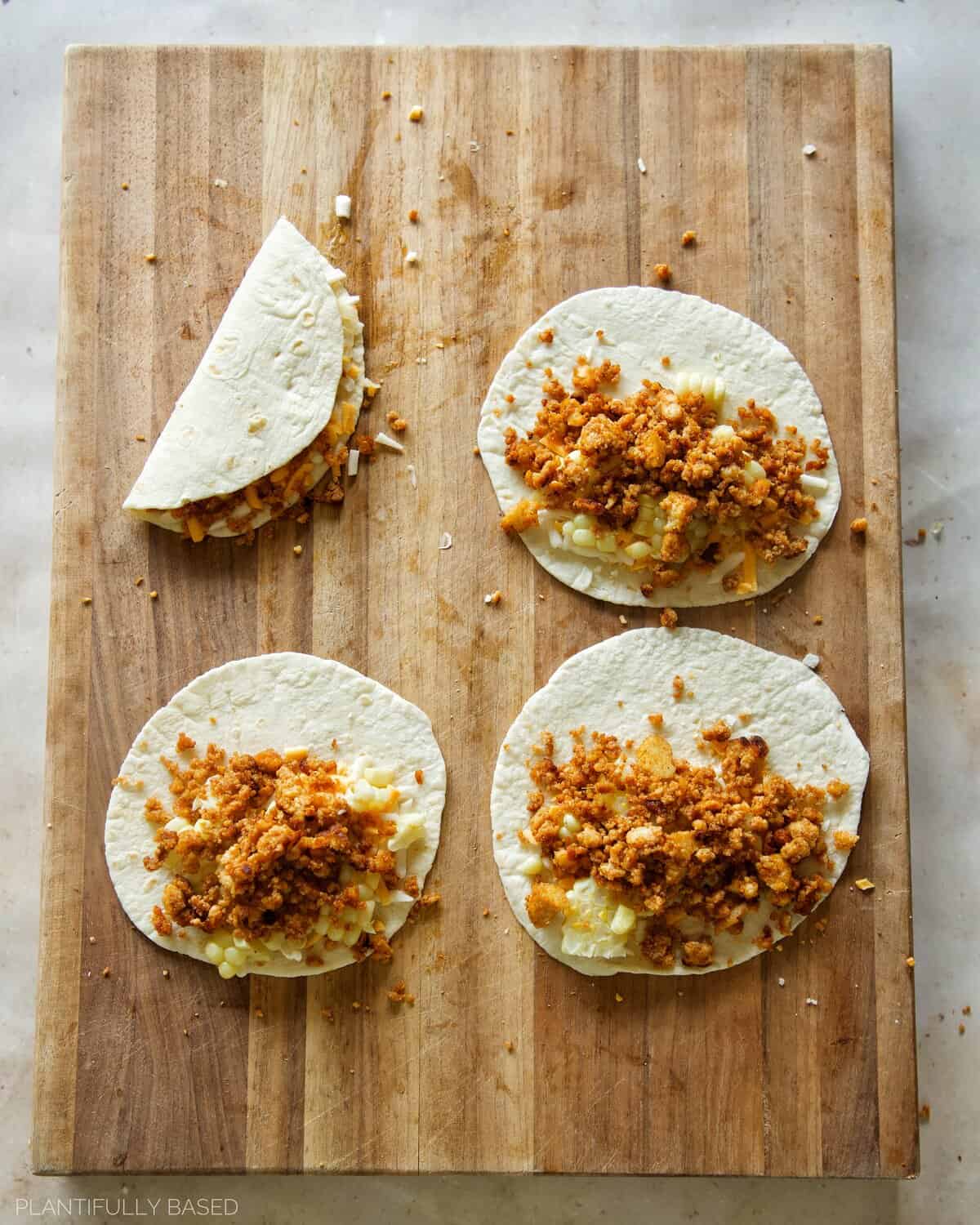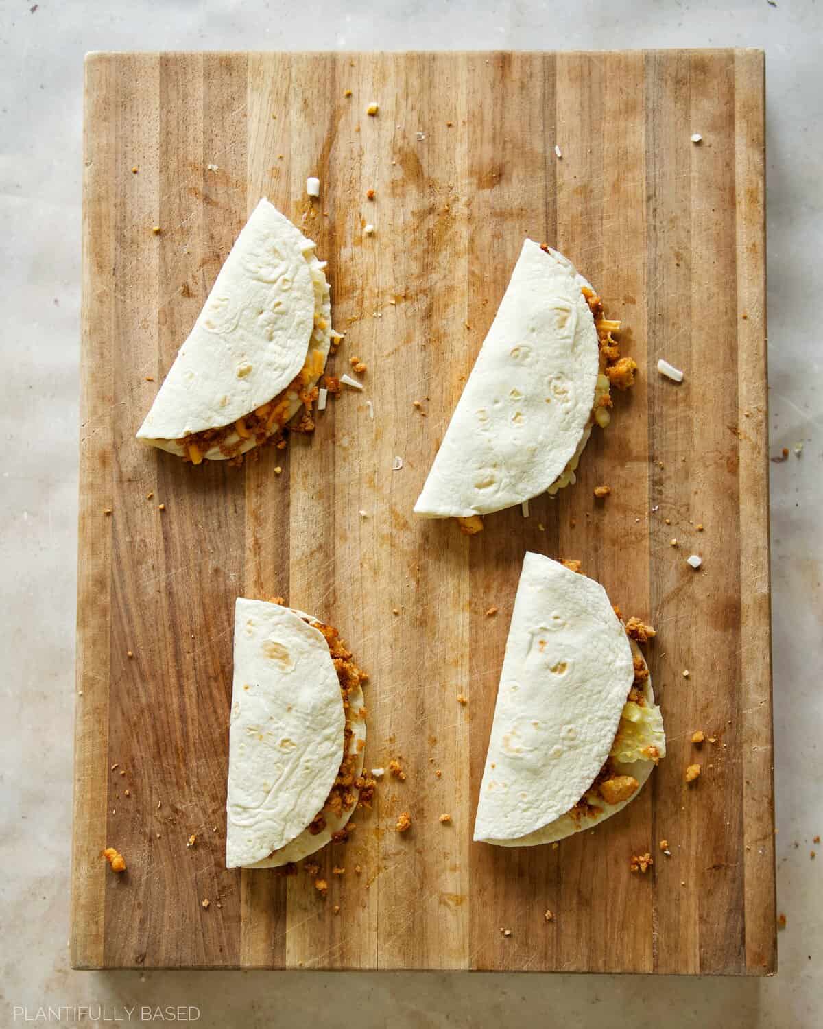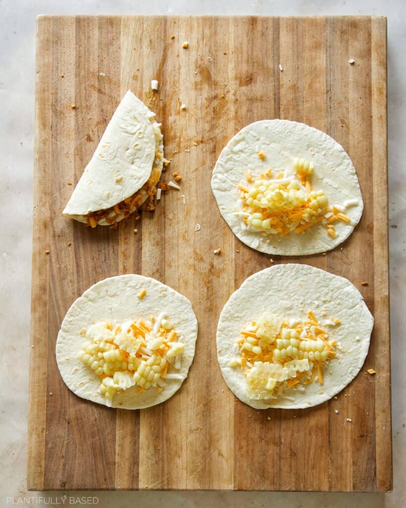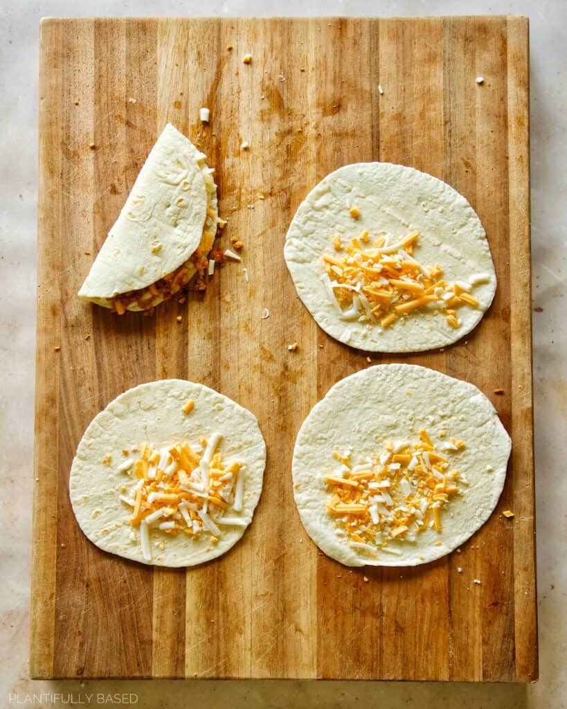 - Lay down the tortillas. Place a small scoop of vegan cheese on the bottom half.