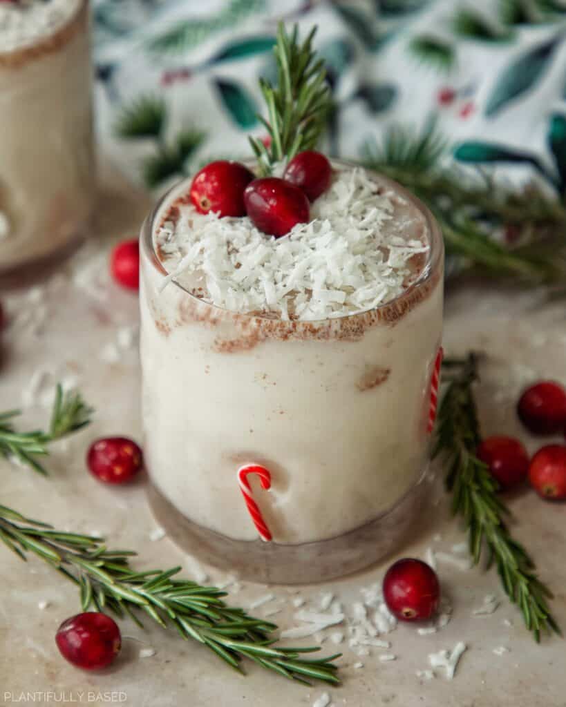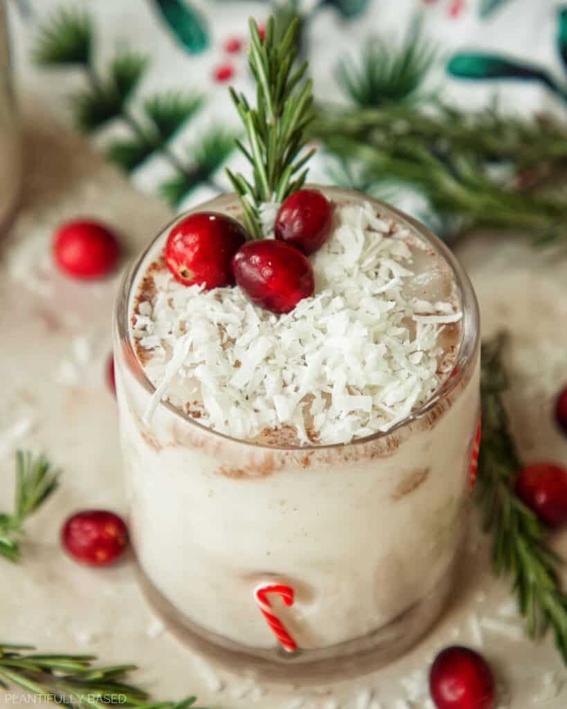 - Cover the top of the drink with the shredded coconut. Then, put in a sprig of rosemary and a few cranberries.