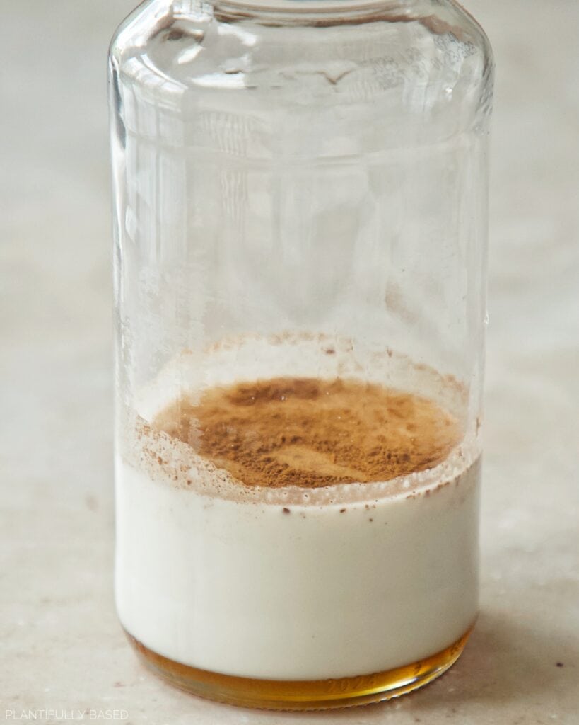 - In a jar or a shaker combine the coconut milk, maple syrup, and ground cinnamon. Shake until well incorporated. Taste it, and add in more maple syrup or cinnamon to your preference.