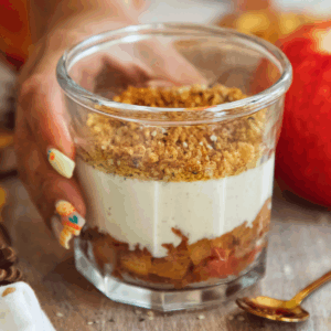 To assemble: if using jars, layer the apples on the bottom, then cover with the yogurt mixture, and finish with the crumble topping. For bowls, layer however you like. Sprinkle with a little extra cinnamon if desired.
