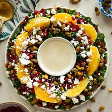 Then, start to build the salad wreath. First, put down all the kale around in a circle. Then, add the orange segments in a circle. Finally, sprinkle the vegan feta, pistachios, and pomegranate seeds all around.