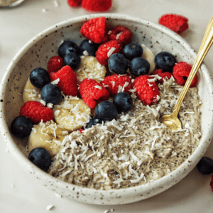 The chia seed pudding will become very thick! Add any toppings you like. This makes either 2 larger servings or 4 smaller servings.