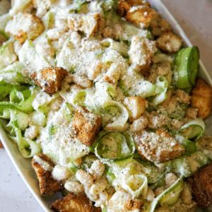 To assemble the salad layer the zucchini ribbons, croutons, and cannellini beans on a large serving plate. Then drizzle the dressing over top and sprinkle the vegan parmesan and black pepper over top. Enjoy immediately.