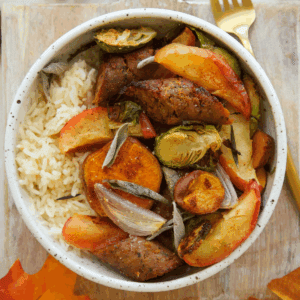 Prepare the produce: Cut the apple into wedges. Slice the sweet potato into ½-inch rounds. Trim the ends of the Brussels sprouts, then cut them crosswise into 4 thin slices. Peel the shallot, then slice it thinly crosswise. Place the apple wedges and sweet potato slices in one bowl, and the Brussels sprouts and shallot in another.
