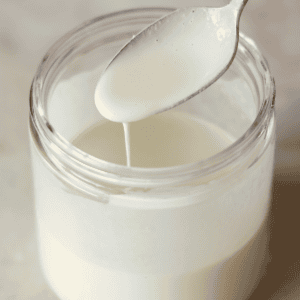 Transfer into a jar and then add the ¼ cup (60ml) of non-dairy milk. Mix together and there you go. If you want you half & half to be thinner you can always add in more non-dairy milk to thin it to your liking.